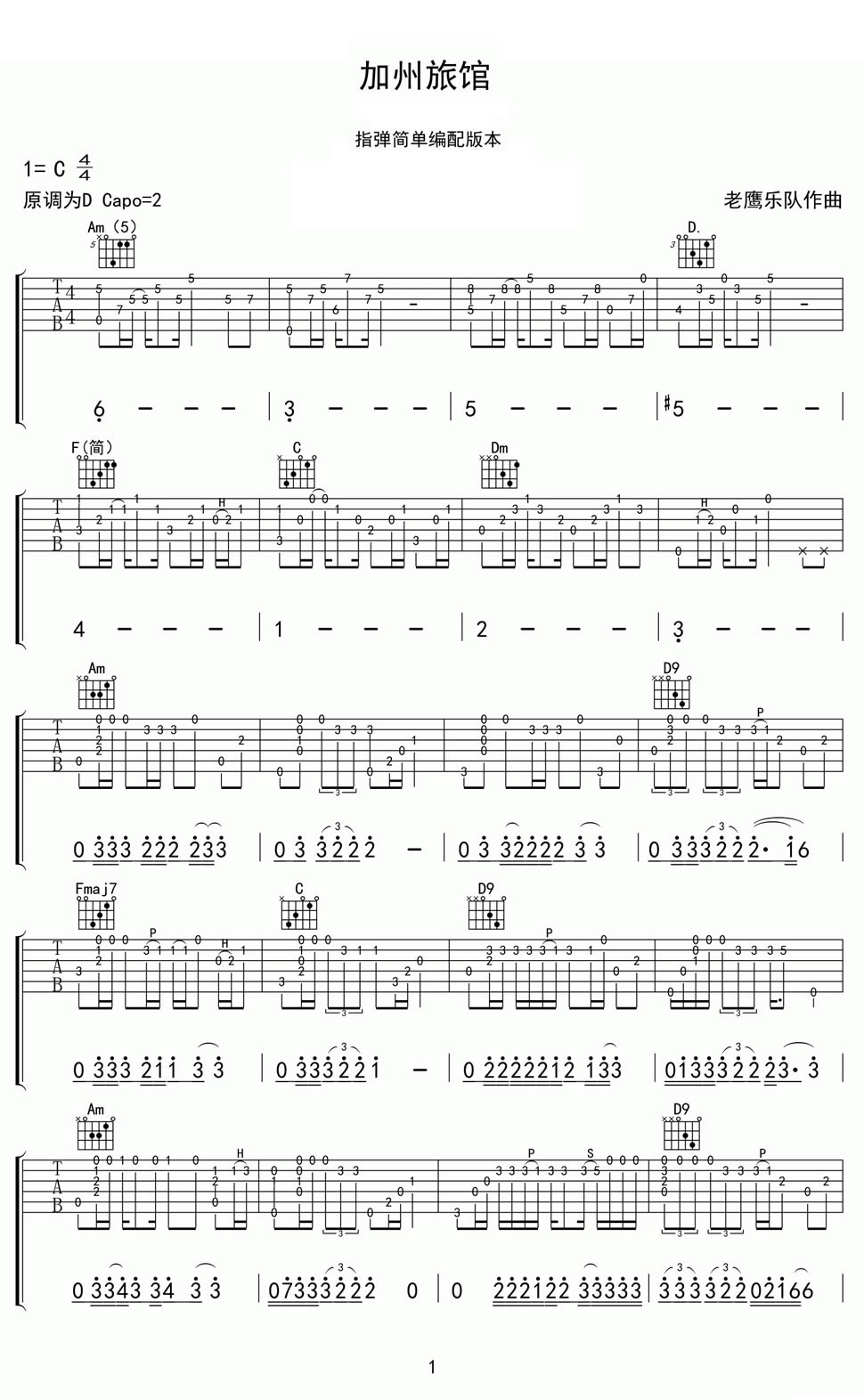 曲谱介绍: 加州旅馆吉他谱指弹版,原调D选调为C调,capo变调夹夹二品。老鹰乐队的经典英文歌曲(Hotel California)《加州旅馆》吉他独奏谱,指弹简单编配版本,曲谱为六线谱高清版图片谱格式。人生每一段旅程都有回忆,每一段回忆都有精彩,就像这首经久不衰的《加州旅馆》,感人心弦的悲世情怀成为无数音乐爱好者单曲循环曲目,经典的吉他旋律深沉忧伤的弹奏,可以让沉淀在记忆里的醇香迸发出所有的力量。Eagles《Hotel California》吉他谱简单版。