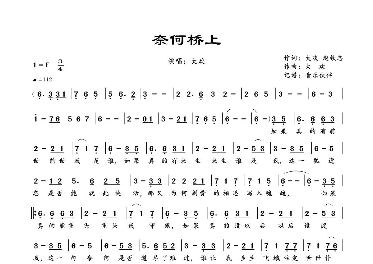 曲谱介绍: 大欢《奈何桥上》,音乐伙伴编配出品,共有1张高清图谱,免翻页排版设计。