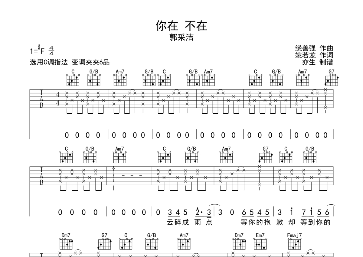 曲谱介绍: 郭采洁《你在不在》吉他弹唱谱,采用C调指法编配,亦生编配出品,共有4张高清图谱。