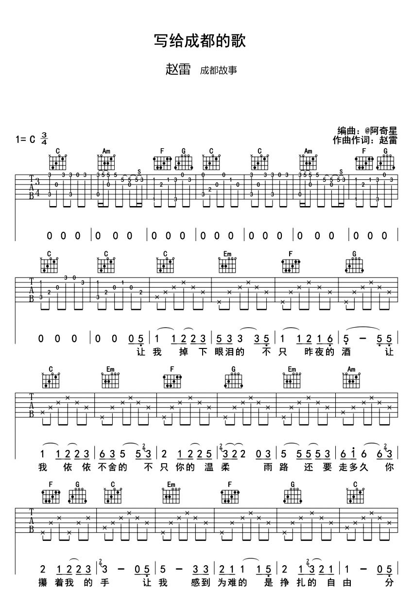 曲谱介绍: 赵雷《写给成都的歌》吉他六线谱,前奏间奏尾奏完整版,C调指法高清图片谱,共三张谱例。爱上一个城市,只需要一首歌的时间。我们都是在离开的时候才知道情感有多深。让我掉下眼泪的不只昨夜的酒,让我依依不舍的不只你的温柔,赵雷演唱的这首成都故事吉他谱,一首让人单曲循环的民谣弹唱歌曲。吉他弹唱谱感谢阿奇星编配分享。