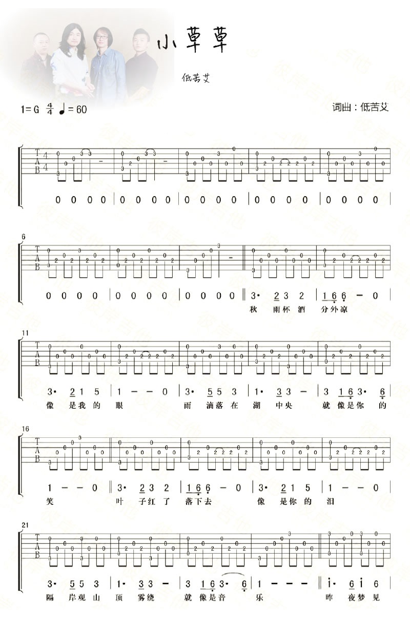 曲谱介绍: 低苦艾乐队小草草吉他谱,六线谱G调编配,三张图片谱。江畔何人初见月,江月何年初照人。小花花 小草草,小树树,小木木 ——低苦艾《花草树木》专辑歌曲吉他弹唱谱,这些歌儿听着不仅没那么萌,可能还会让你不自觉地眼泪掉下来!