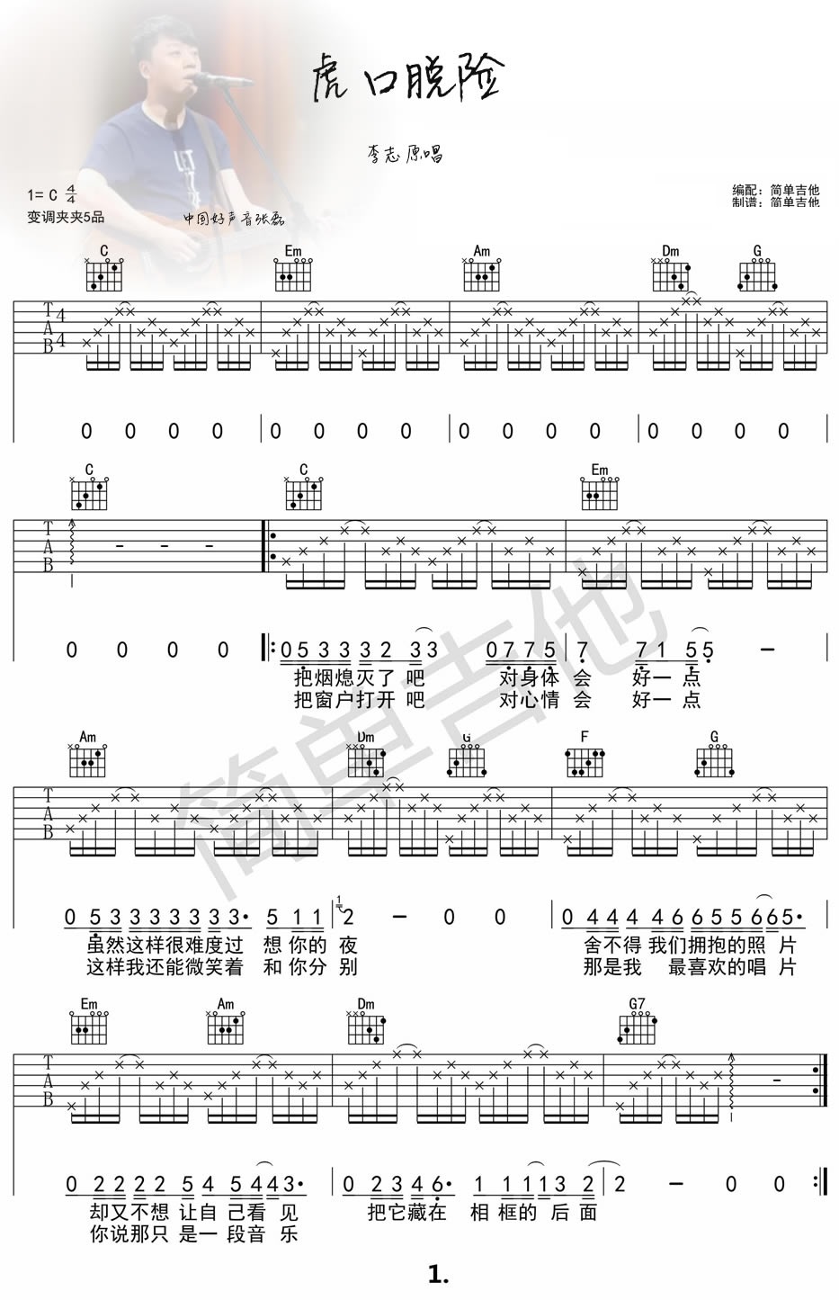 曲谱介绍:  虎口脱险吉他谱,C调指法六线谱,三张图片谱,虎口脱险吉他谱简单版,老狼原唱的民谣弹唱歌曲,中国好声音节目张磊质朴真诚而发自内心的歌唱,给人留下深刻的印象。