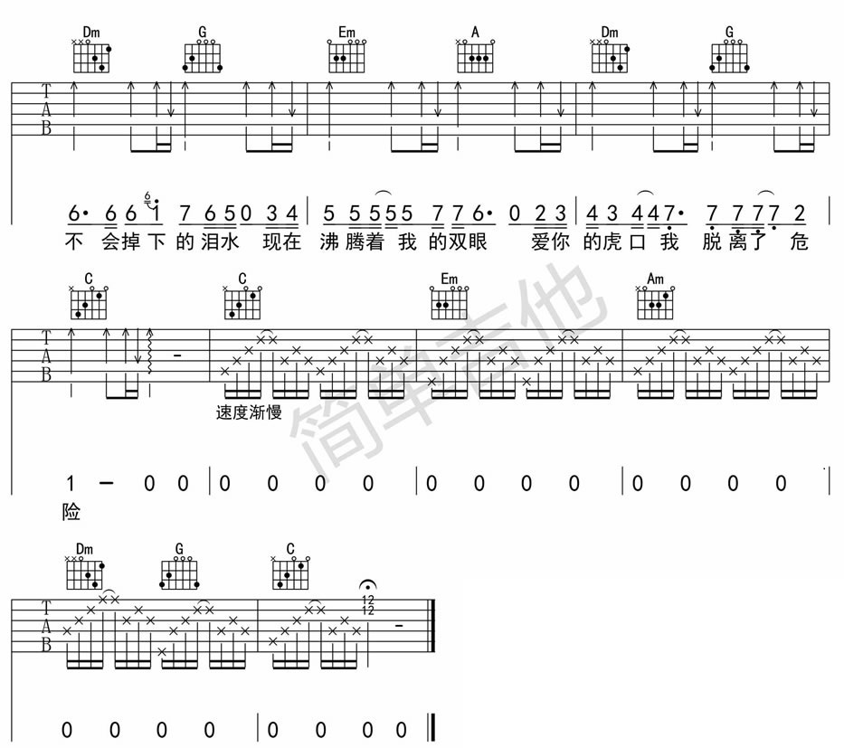 虎口脱险简单版 张磊 C调指法六线吉他谱 - 张磊 - C调吉他弹唱谱