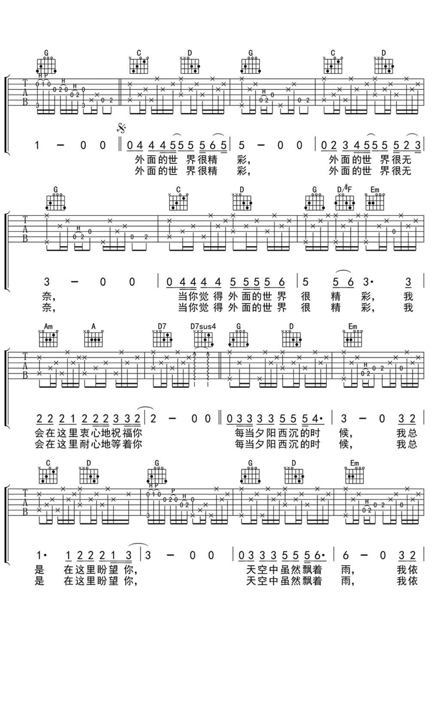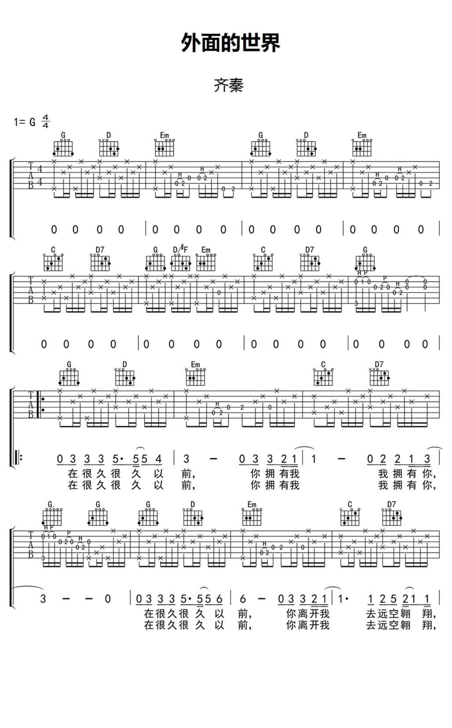外面的世界吉他谱 - 齐秦 - G调吉他弹唱谱