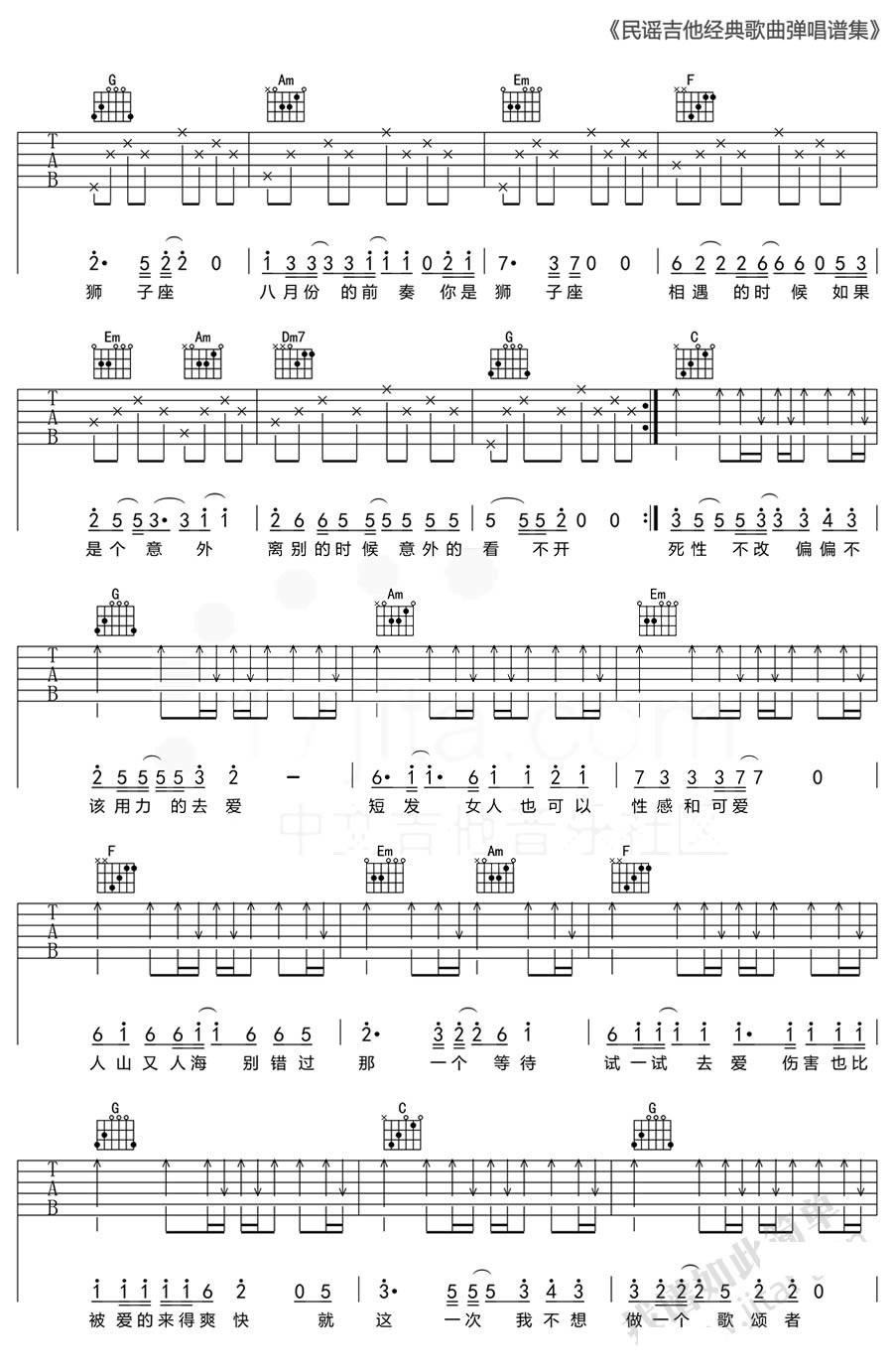 当前位置:琴谱网>吉他弹唱>狮子座 C调简单版 曾轶可 吉他六线