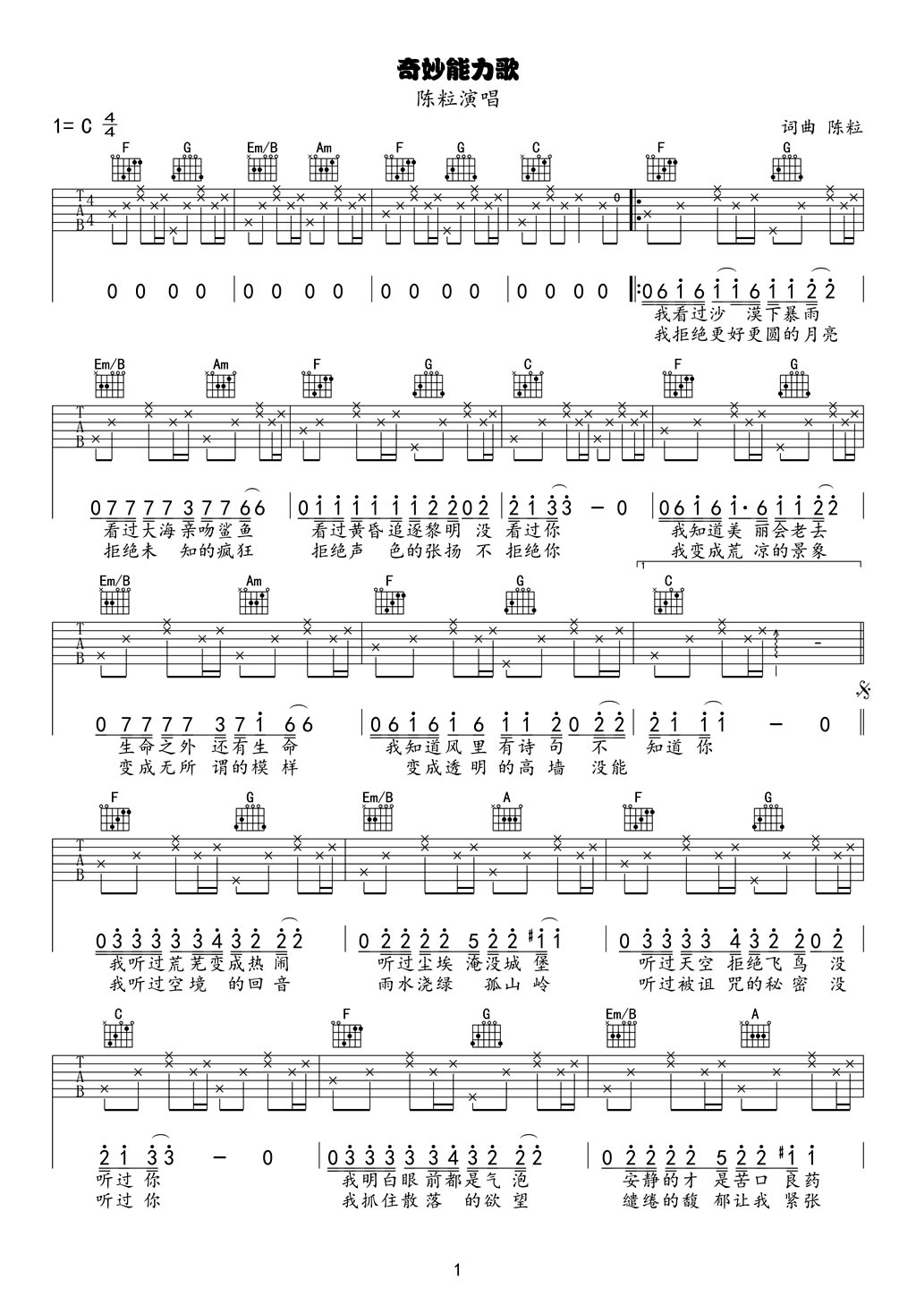 曲谱介绍: 陈粒《奇妙能力歌》吉他谱,C调六线谱编配,奇妙能力歌吉他谱,民谣歌手陈粒的一首无论歌词还是旋律都充满魔力的奇妙能力歌,安安静静地弹唱,干干净净的嗓音,简简单单的和弦伴奏,娓娓唱出小女子色彩张扬的奇妙世界。