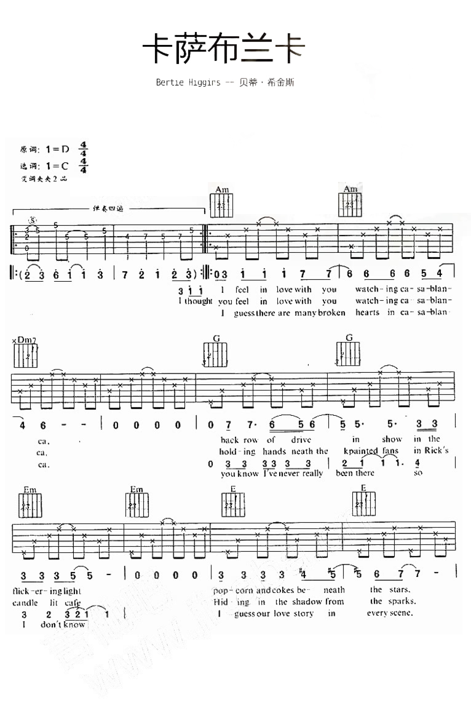 卡萨布兰卡吉他谱 - Bertie Higgins - C调吉他弹唱谱