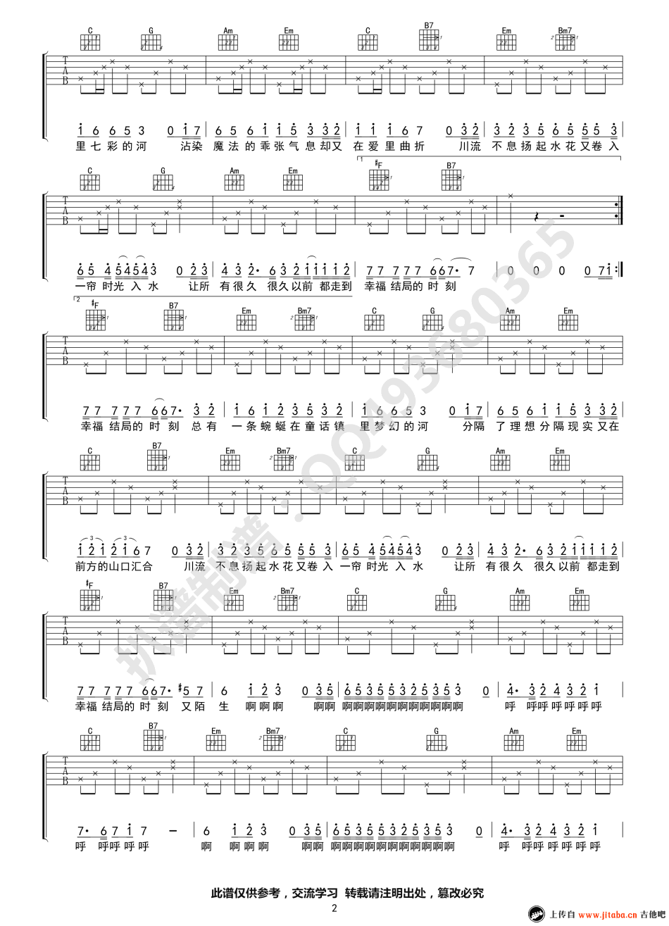曲谱介绍: 陈一发儿《童话镇》吉他谱,原调C,选调G,变调夹夹五品。童话镇吉他谱,六线谱高清编配,三张图片谱。一首节奏轻快、非常好听的《童话镇》,来自斗鱼直播的发姐陈一发儿。“总有一条蜿蜒在童话镇里七彩的河,分隔了理想分隔现实又在前方的山口会合。”歌声中带着一股温暖的魔力,不断的涤荡着心灵,仿佛带我们进入了一个又一个神奇的童话世界。或许在某一个瞬间,似乎又回到了那单纯又美好的时空。