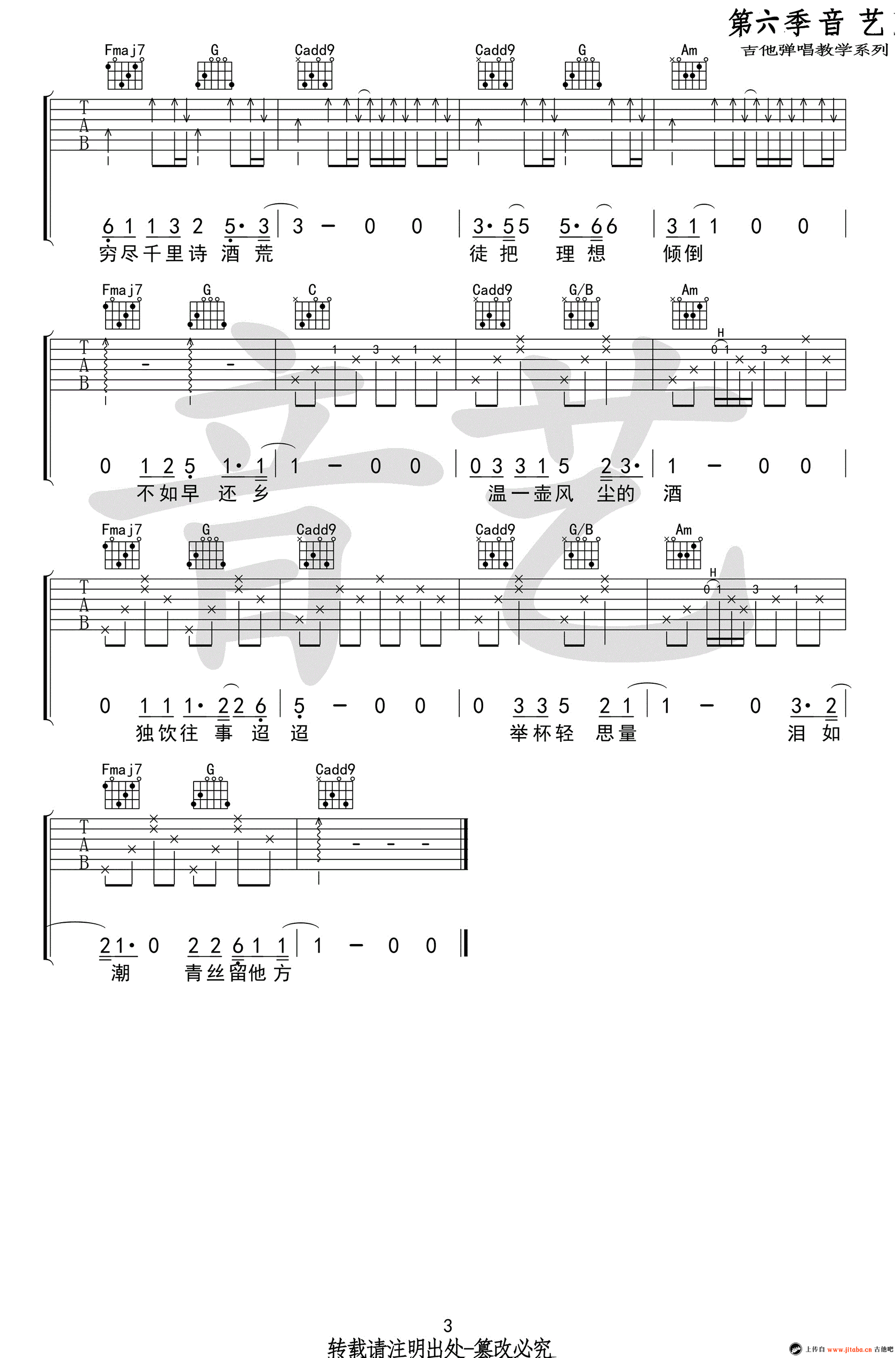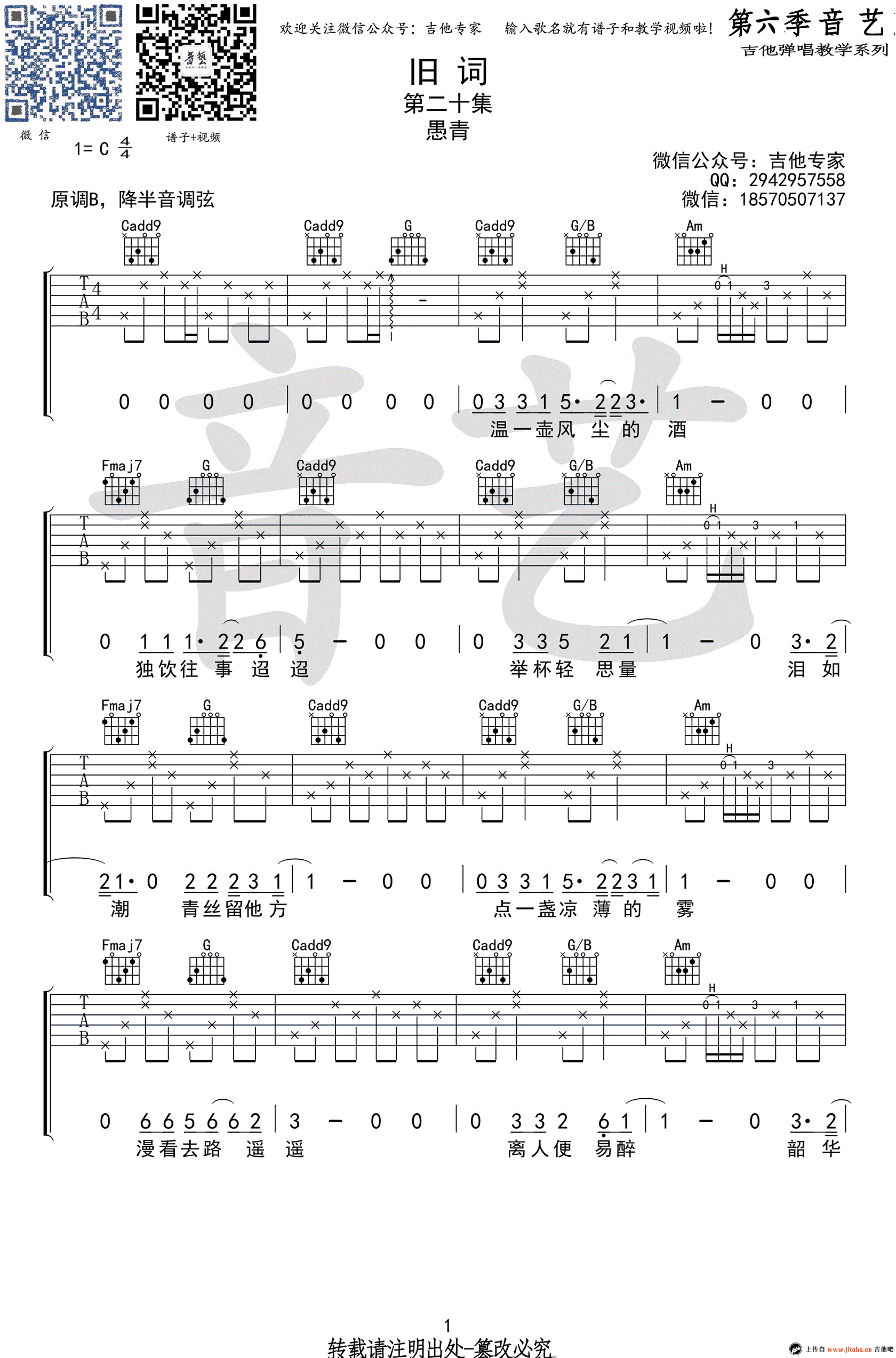 曲谱介绍: 愚青《旧词》吉他谱,原调B,降半音调弦,选用C调指法编配。愚青《青鸟与诗》专辑收录,旧词六线谱,高清弹唱谱,三张图片谱。感谢音艺吉他编配,91吉他谱网站上传。