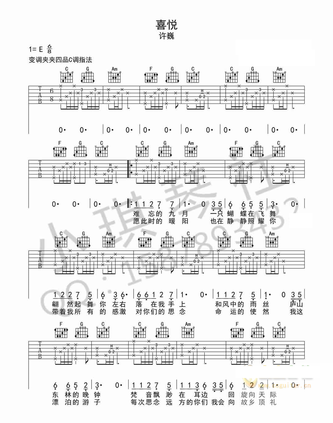 喜悦 许巍 C调六线吉他谱 - 喜悦 - C调吉他弹唱谱
