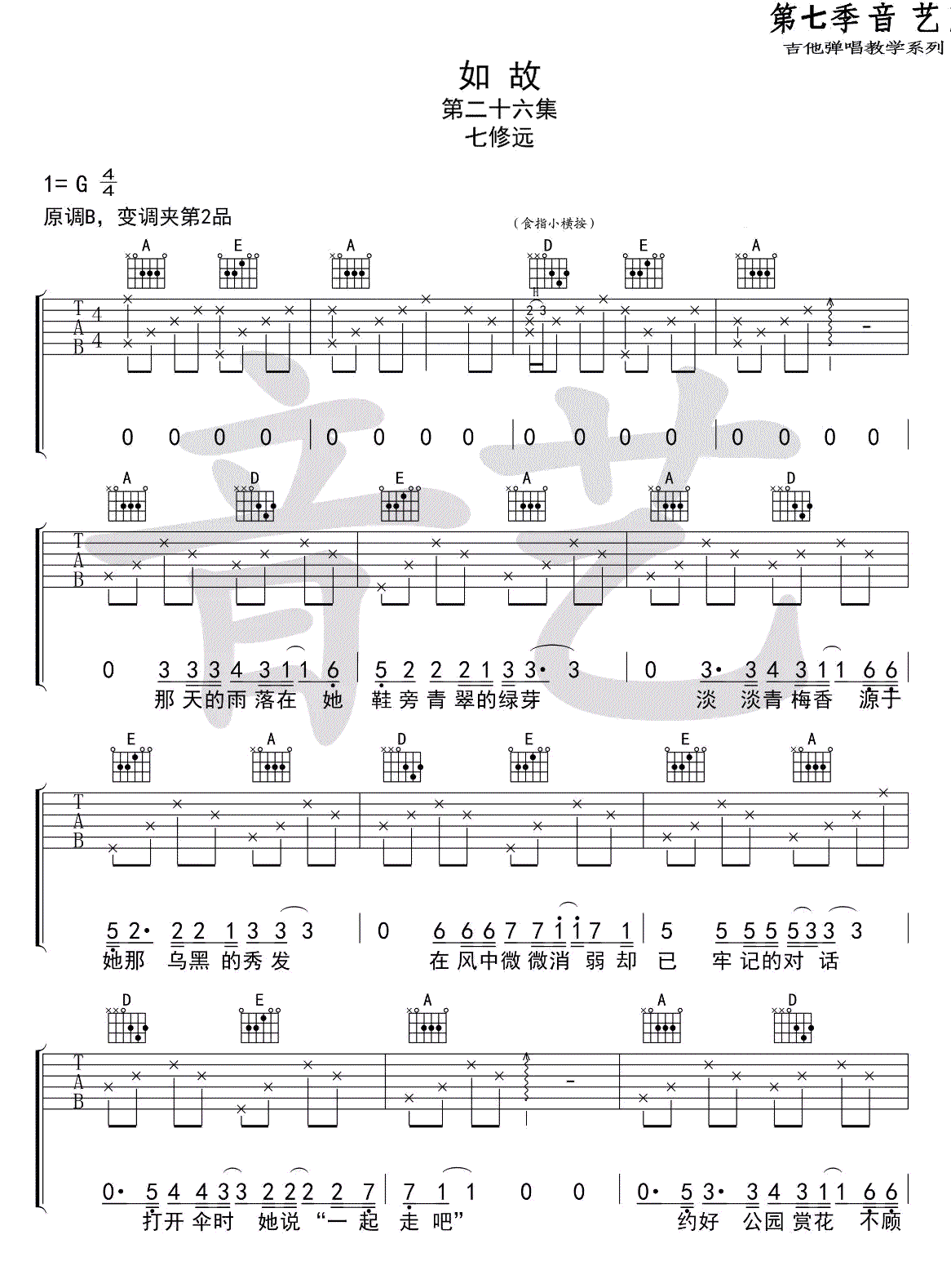 曲谱介绍: 七修远《如故》吉他谱,原调B,变调夹夹二品,选用G调指法编配,如故吉他弹唱谱,高清图片谱共四张谱例,感谢音艺吉他出品。