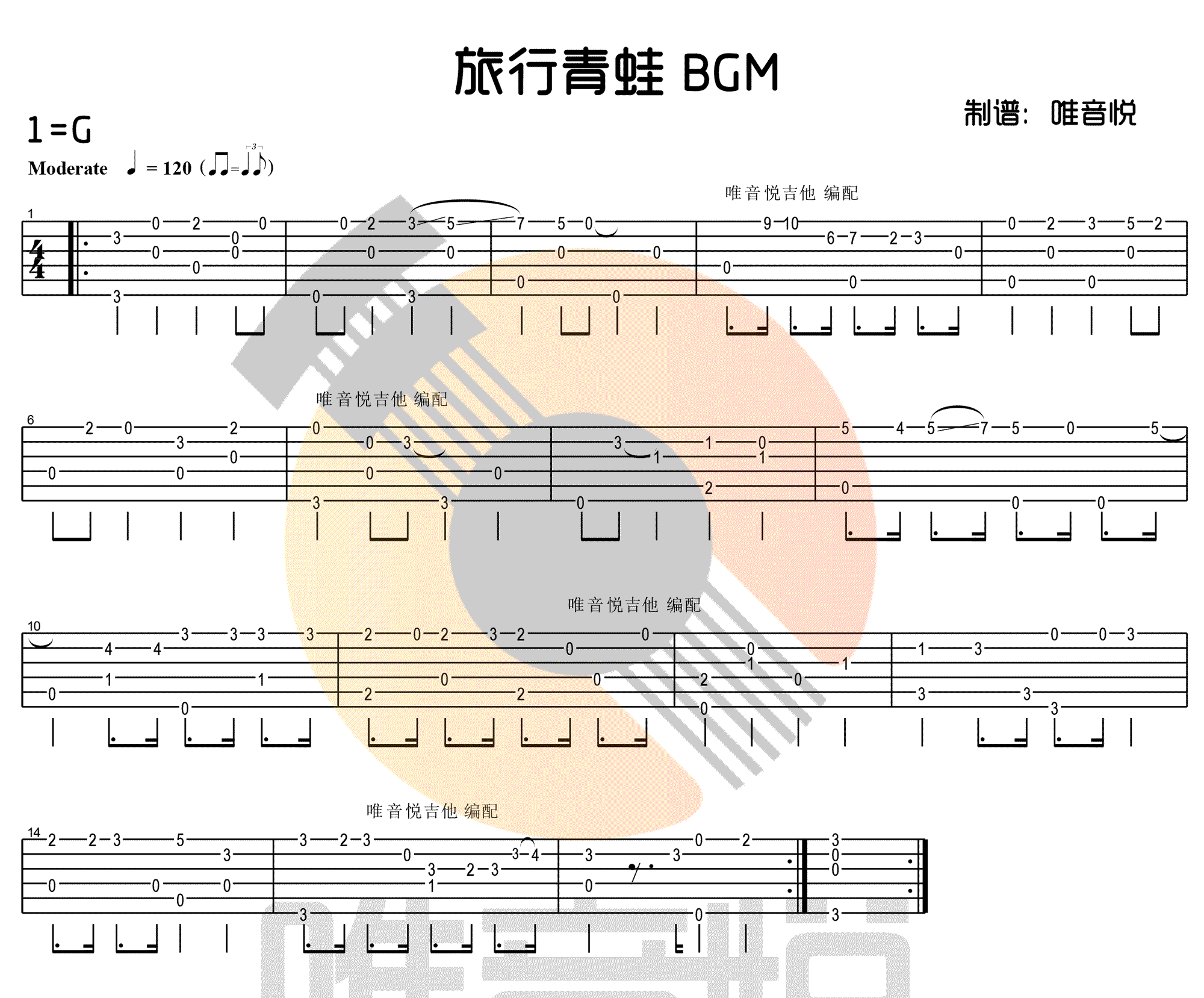 曲谱介绍: 旅行青蛙指弹吉他谱旅行青蛙BGM吉他谱,简单吉他指弹谱,高清图片谱,旅行青蛙吉他独奏谱,这个指弹难度其实还是比较大,主要是曲子里会有两个节奏型,一个是Swing节奏型,两个八分音符的要抓好这个摇摆感;还有一个是附点的节奏型,这两个节奏型都是比较难的节奏,琴友们演奏时需要多加注意。 一款养生休闲小游戏,受到广大佛系青年的喜爱,成为了朋友圈新式刷屏内容。除了每天打开游戏沉迷养蛙,还莫名地被BGM给洗脑了!那就弹奏这首曲子,等你的蛙回来吧!