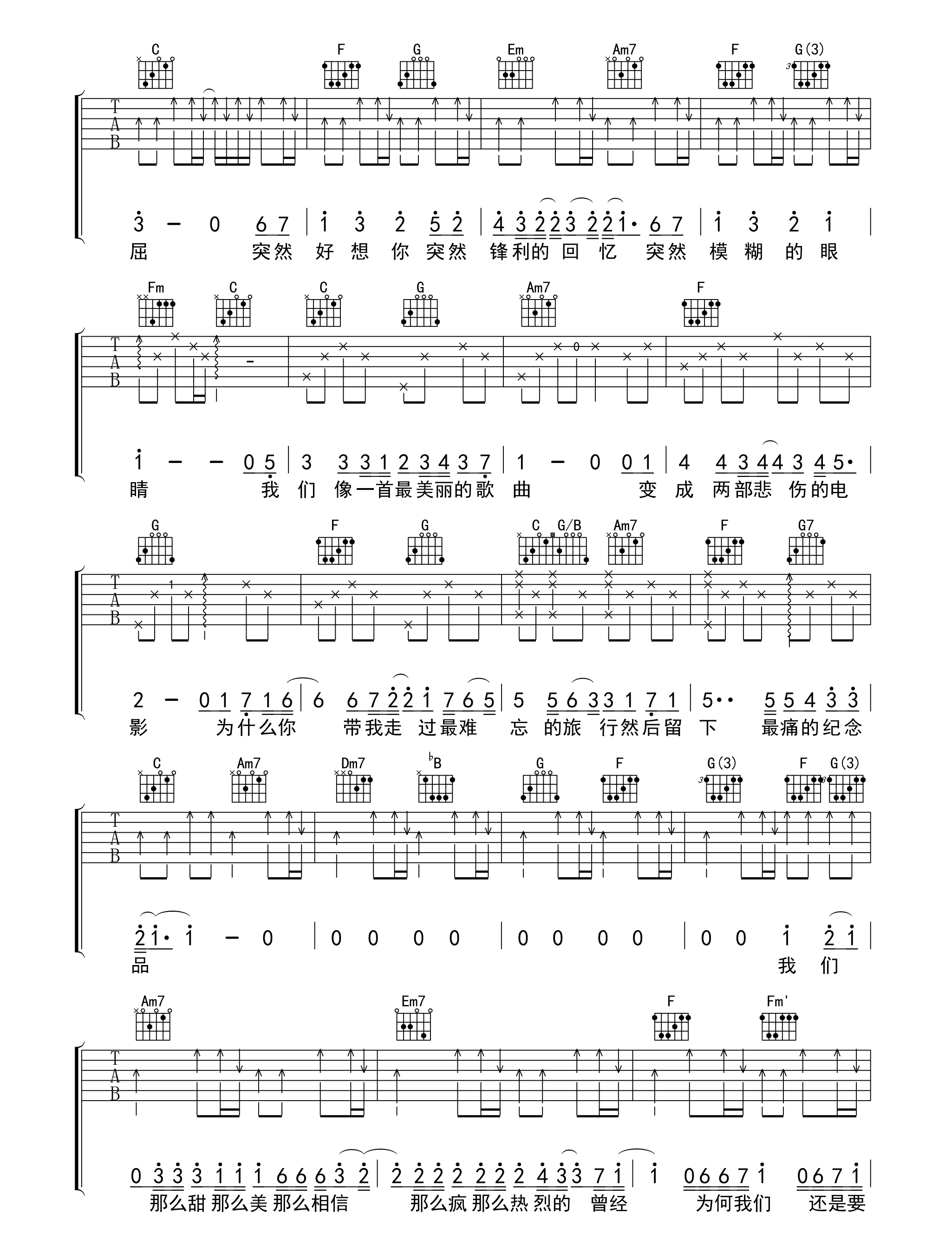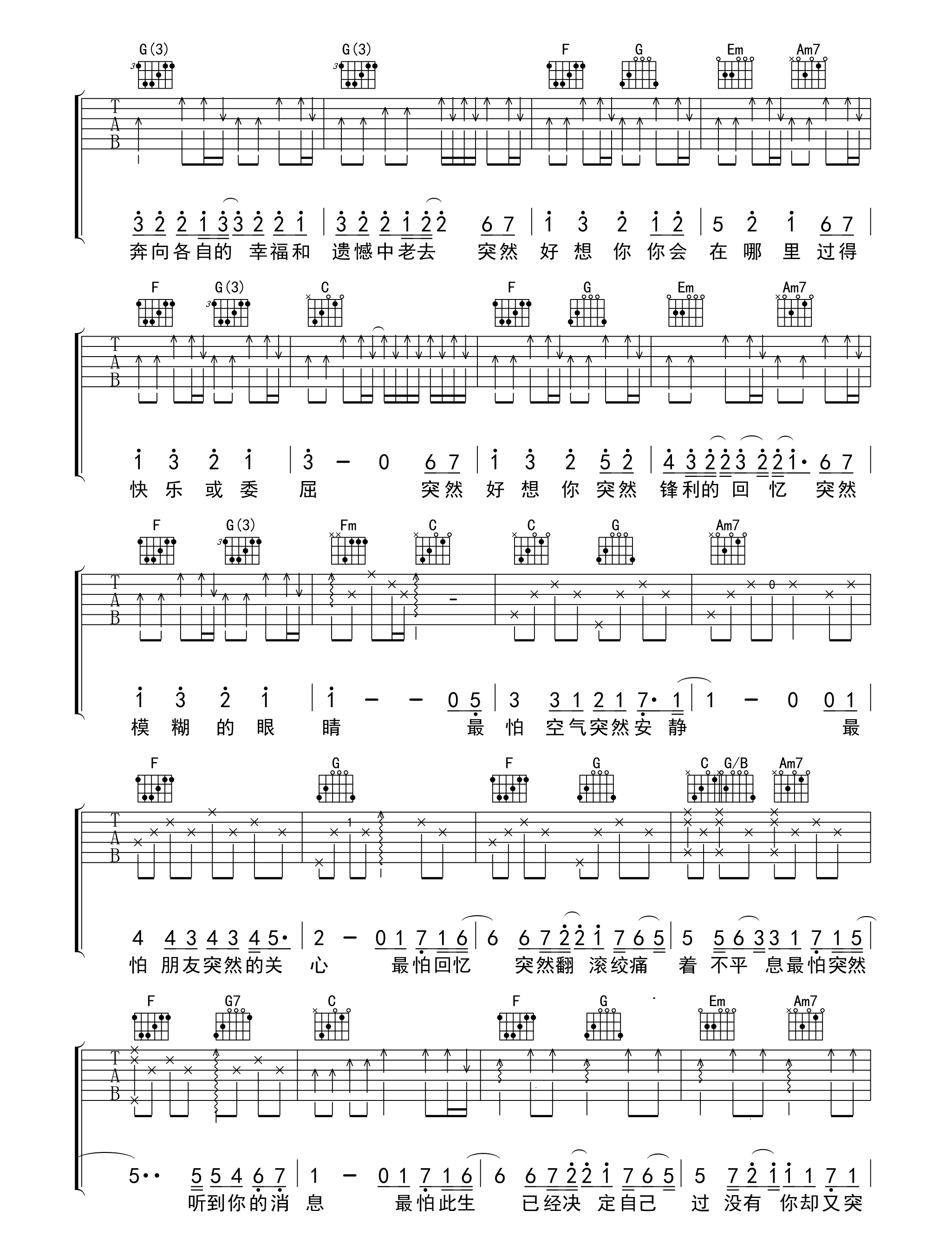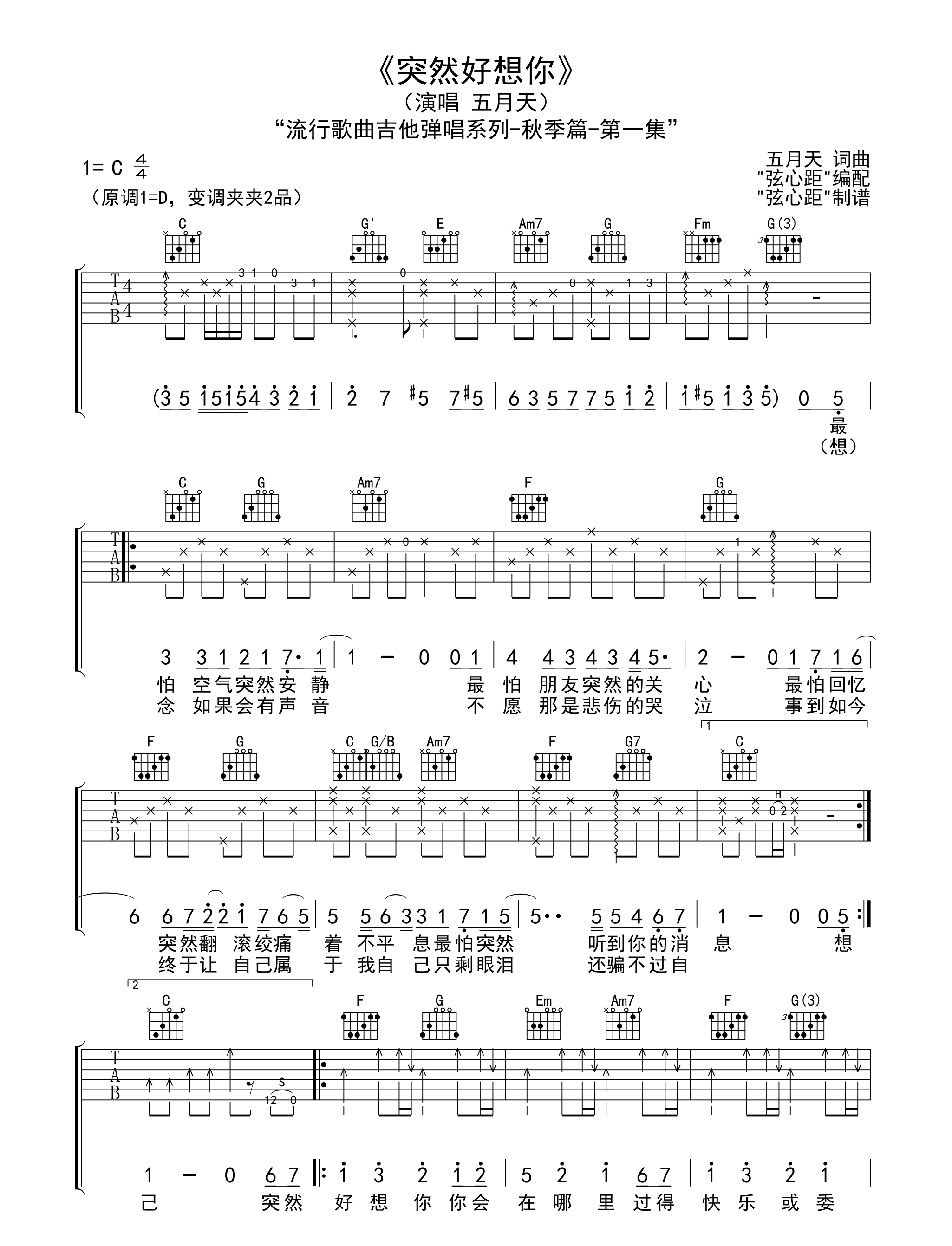 突然好想你 五月天 C调六线吉他谱 - 突然好想你 - C调吉他弹唱谱
