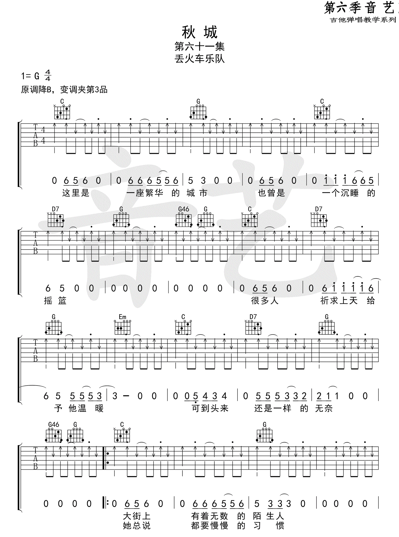 曲谱介绍: 丢火车乐队《秋城》吉他谱,原调降B,采用G调指法,变调夹夹第三品。秋城六线谱,高清弹唱图片谱。一首简单容易上手的歌曲,没有大小横按。