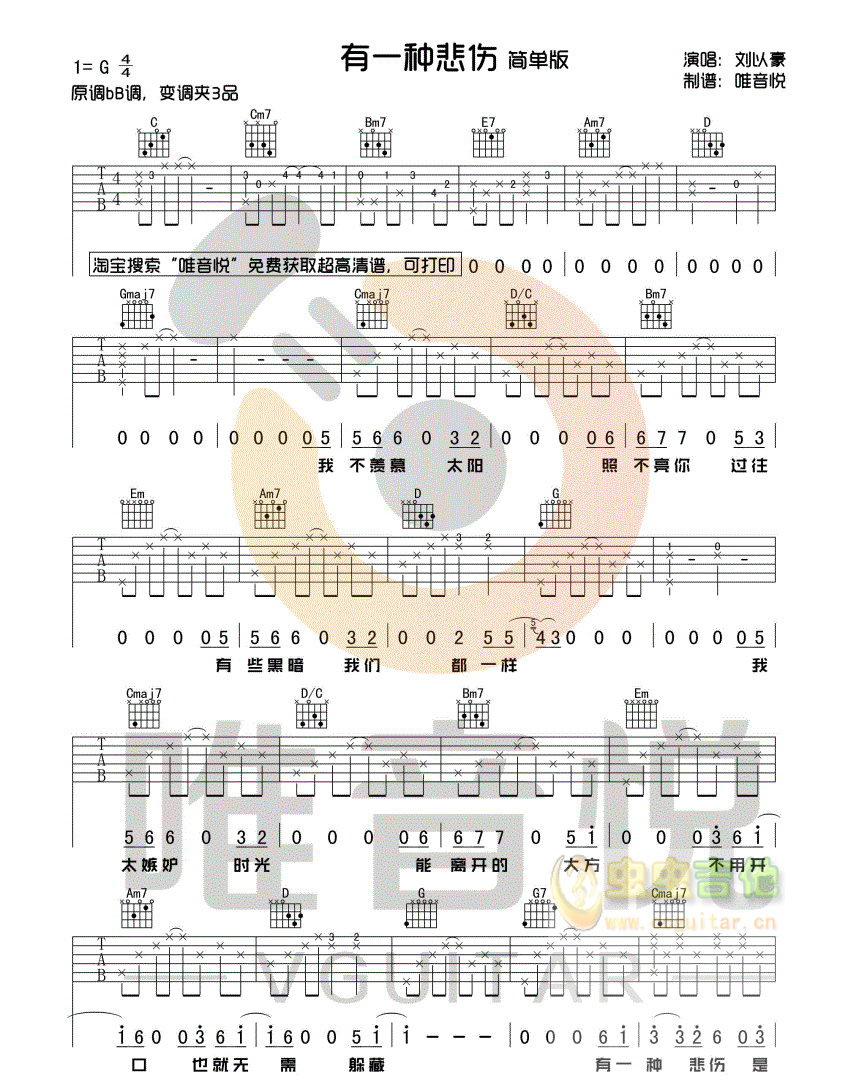 有一种悲伤 刘以豪 G调六线吉他谱 - 有一种悲伤 - G调吉他弹唱谱