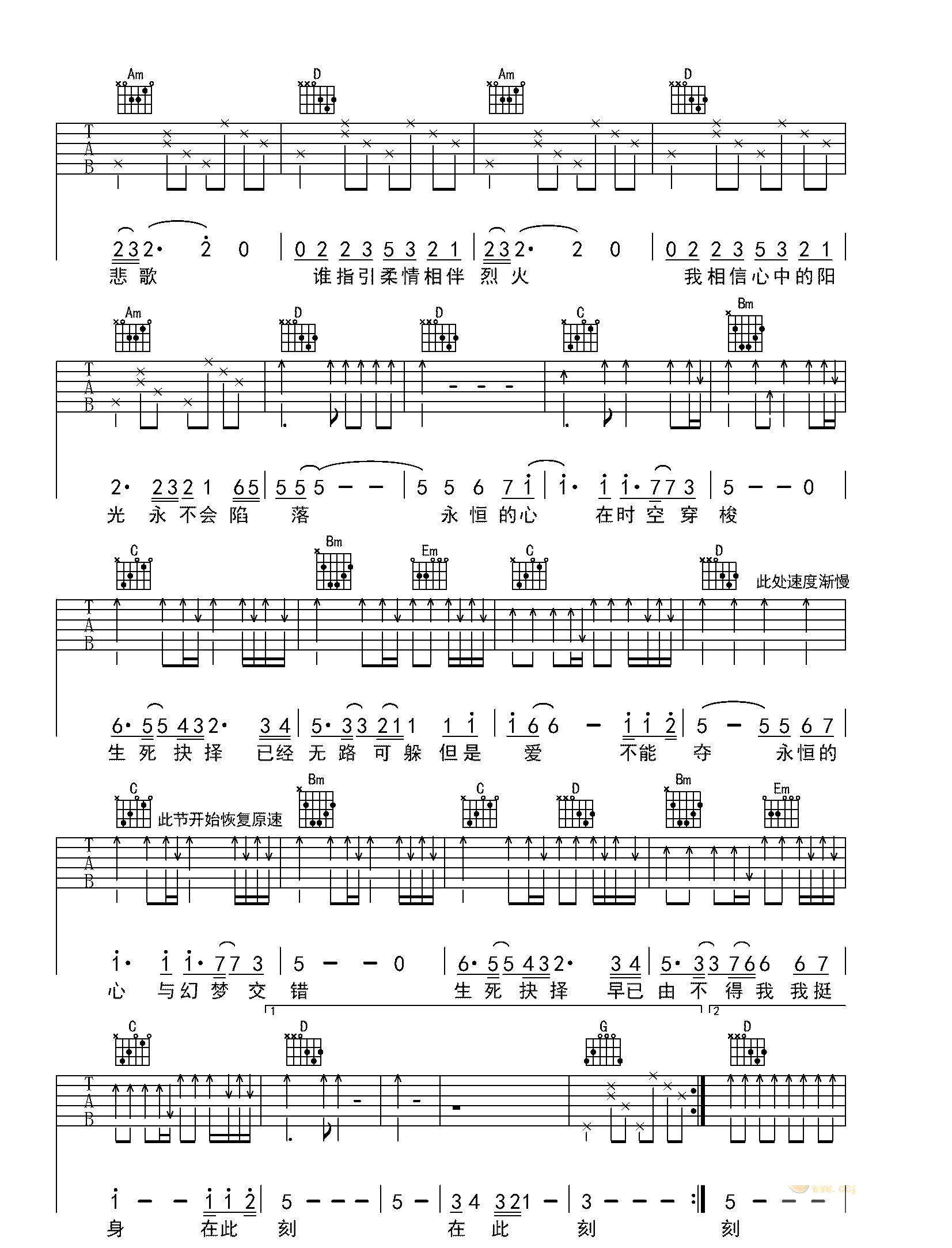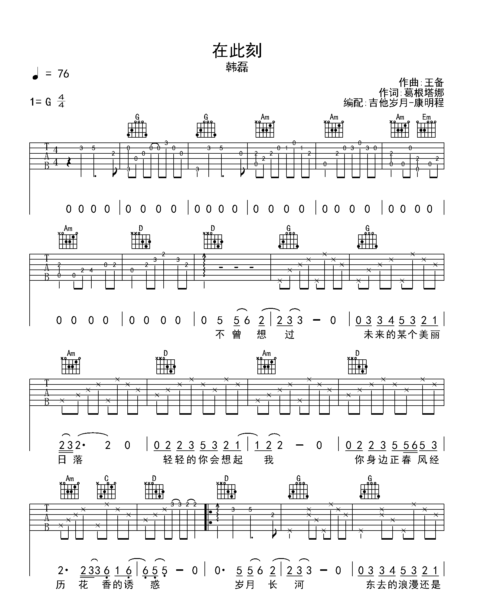 曲谱介绍: 在此刻《在此刻韩磊G调六线》吉他弹唱谱,采用G调指法编配,共有3张高清图谱。