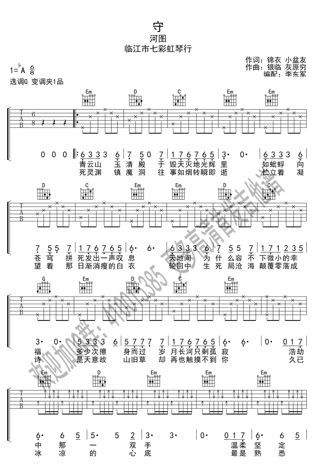曲谱介绍: 《守》吉他谱,河图演唱,选调G,变调夹夹第一品,守吉他弹唱谱,《诛仙世界》官方推介歌曲,七彩虹琴行出品!   想念却无法相守,执手却又有天涯。千年流转,生死爱恋,唯美的中国风元素的词曲勾画出一幅《诛仙世界》的故事,讲述了经历为爱千年的守候,却又无奈错过的遗憾。