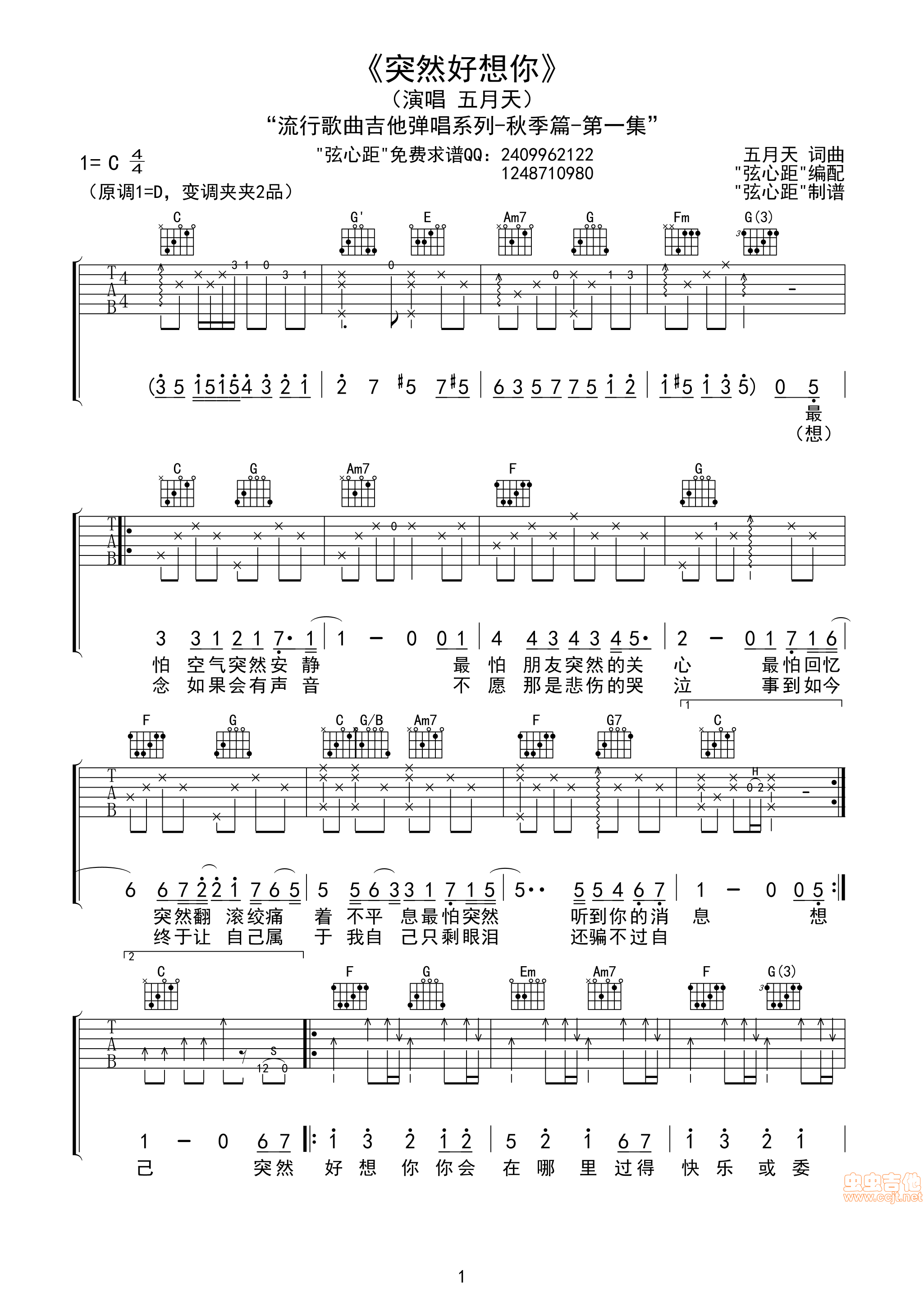 突然好想你吉他谱 - 五月天 - C调吉他弹唱谱
