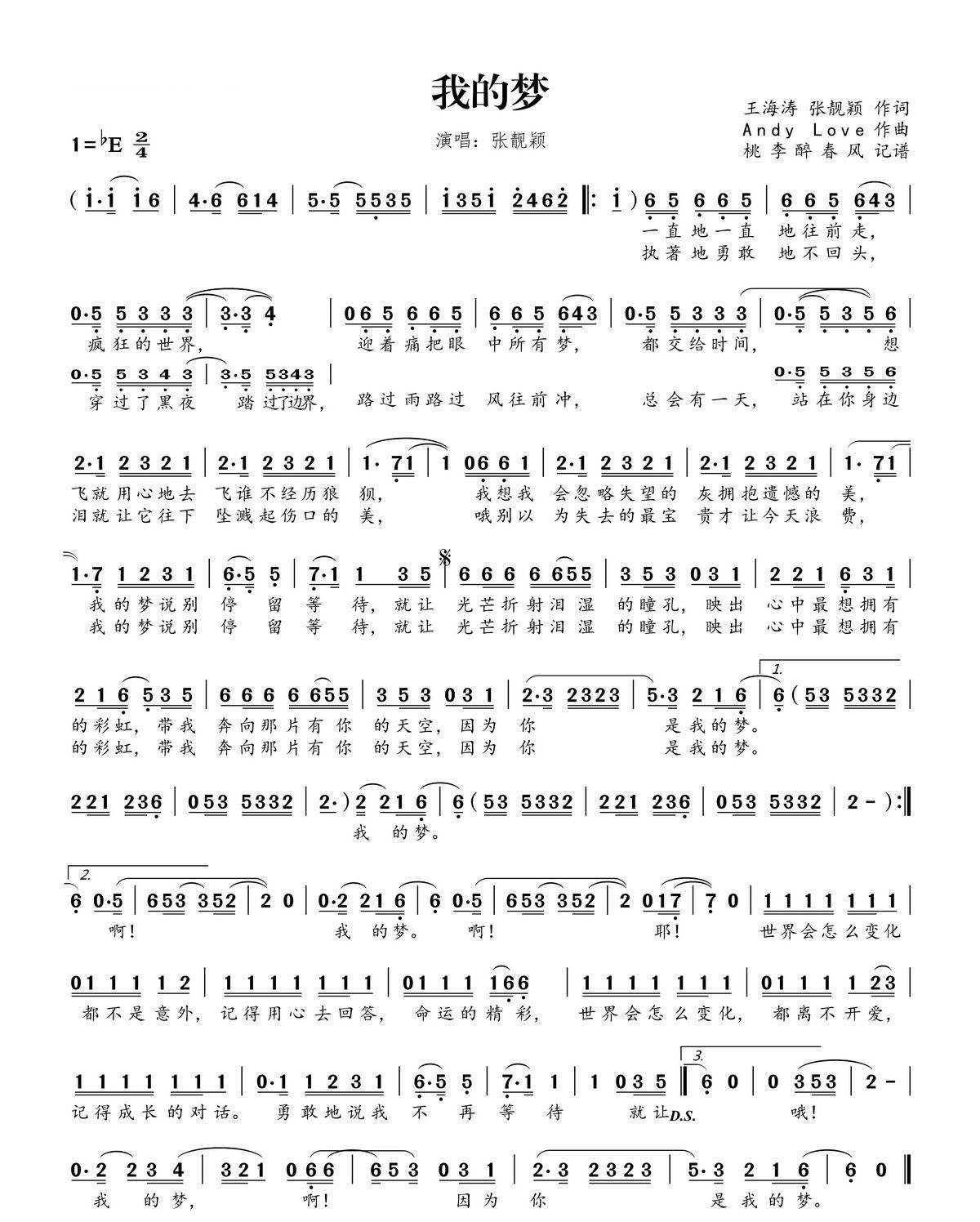 曲谱介绍: 我的梦吉他谱,张靓颖演唱,我的梦弹唱谱,原调降E选调C,变调夹夹三品。太阳穿过云层就能散发炽热的光芒,愿每个梦都不被辜负,我们的梦永不落空。   张靓颖中英文双单曲《我的梦》,励志鼓舞人心,英文版是《Dream It Possible》,梦想的实现需要不懈的努力追求,成功属于每一个坚定的信念,每一个脚踏实地的奋斗者!