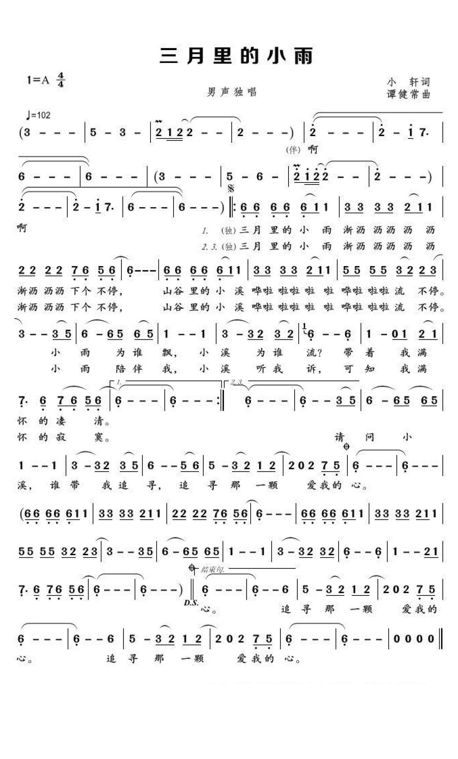曲谱介绍: 刘文正《三月里的小雨》歌词_简谱