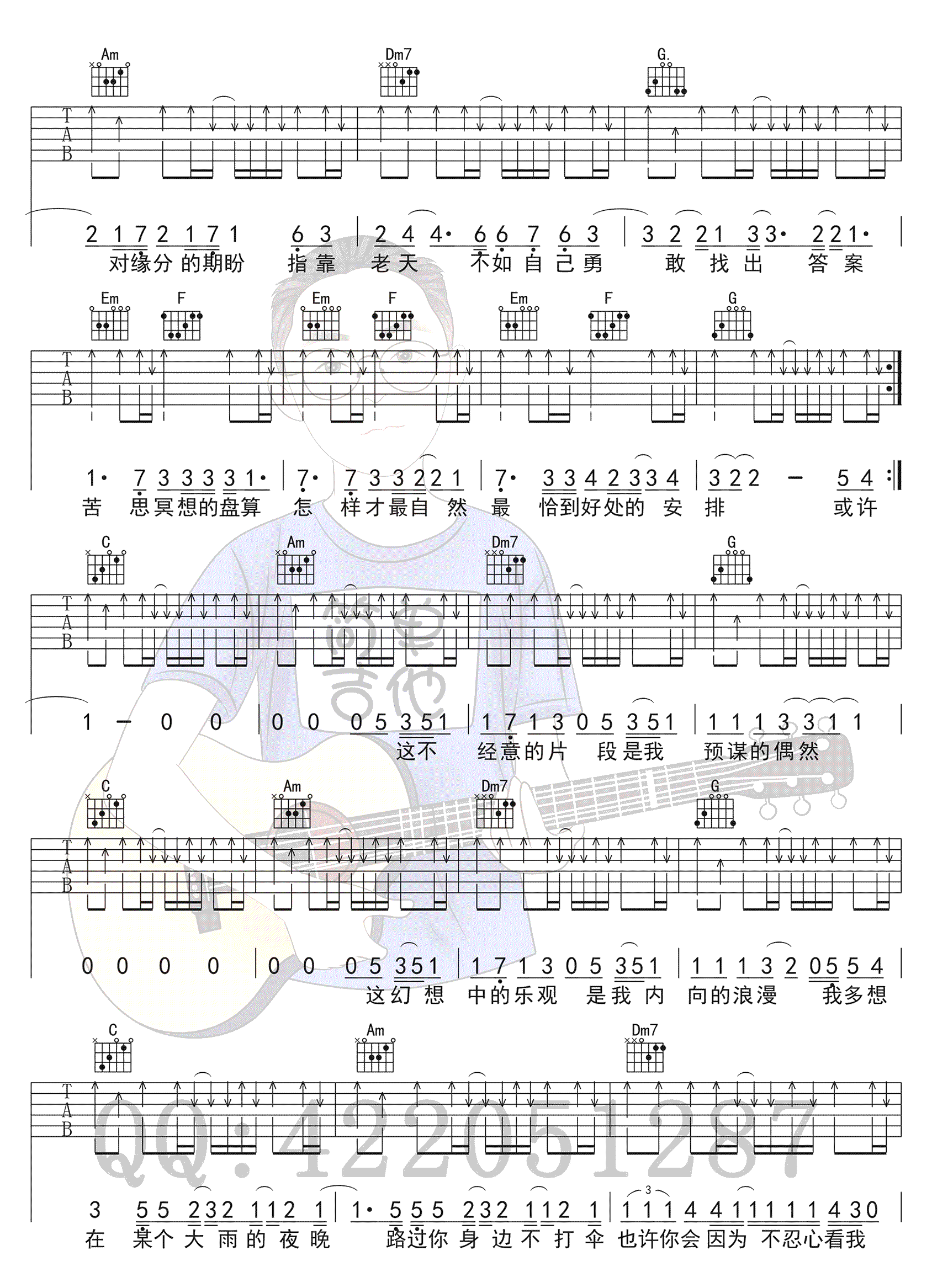 曲谱介绍: 阿肆《预谋邂逅》吉他谱,C调指法,降半音调弦,“炸鸡少女”阿肆的一首好听的歌曲,预谋邂逅六线谱,四张高清图片谱,简单吉他编配出品。