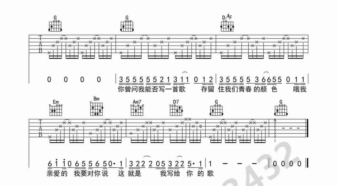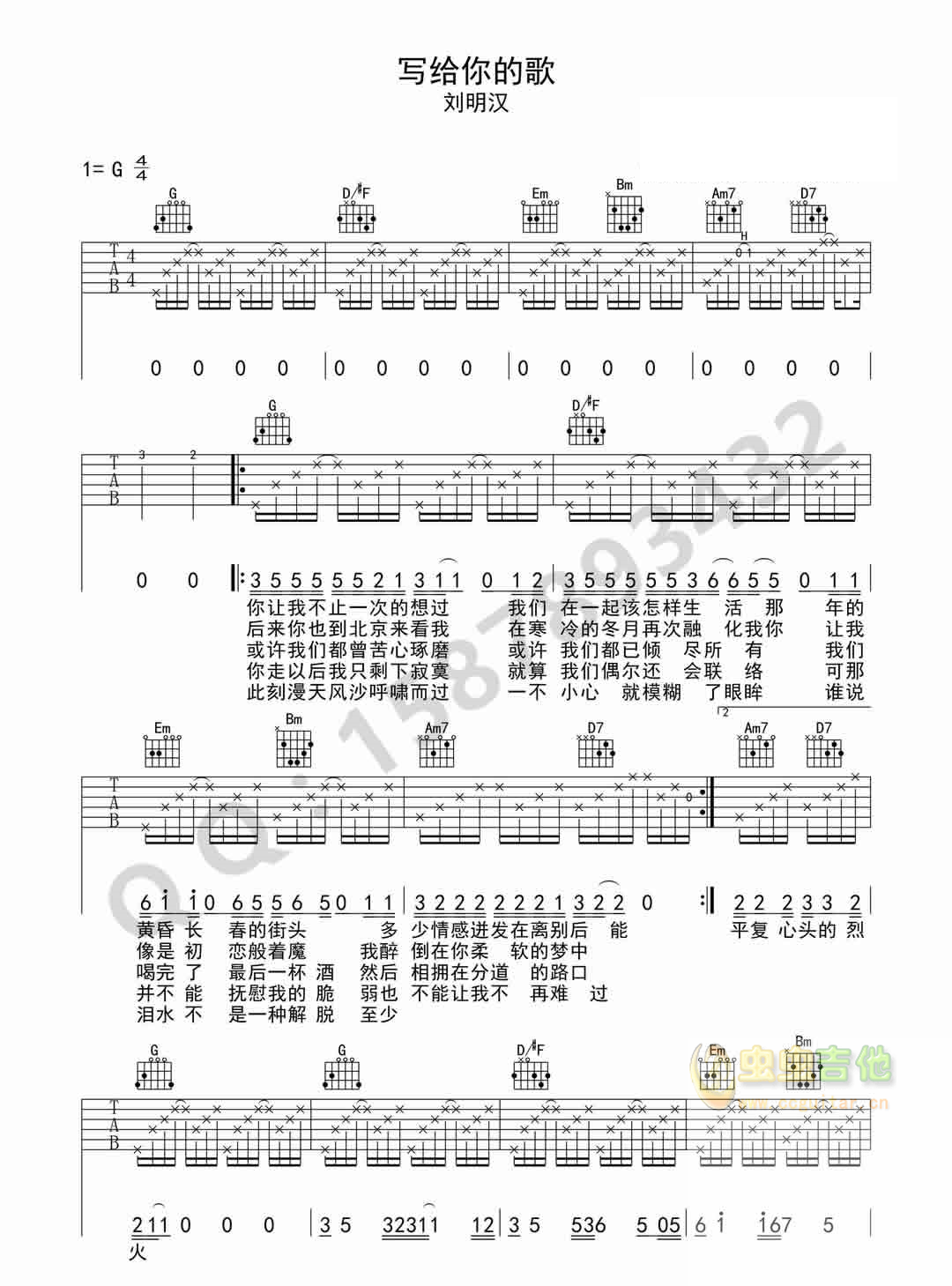 曲谱介绍: 写给你的歌《写给你的歌刘明汉G调六线》吉他弹唱谱,采用G调指法编配,共有3张高清图谱。