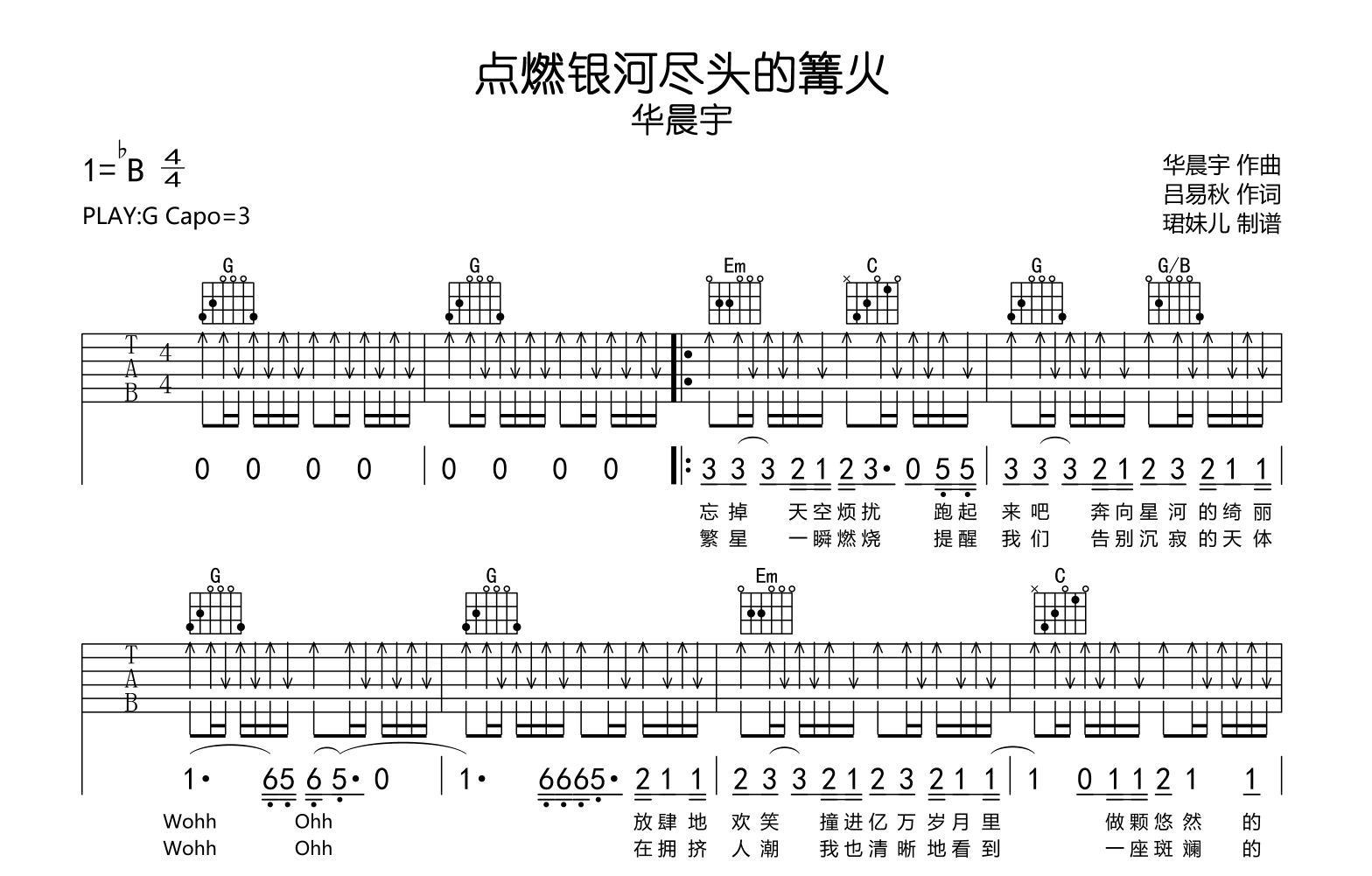 曲谱介绍: 点燃银河尽头的篝火吉他谱,华晨宇演唱,《点燃银河尽头的篝火》吉他弹唱六线谱,原调bB,采用G调指法编配,建议变调夹3品,速度75BPM难度较简单,演奏易上手。