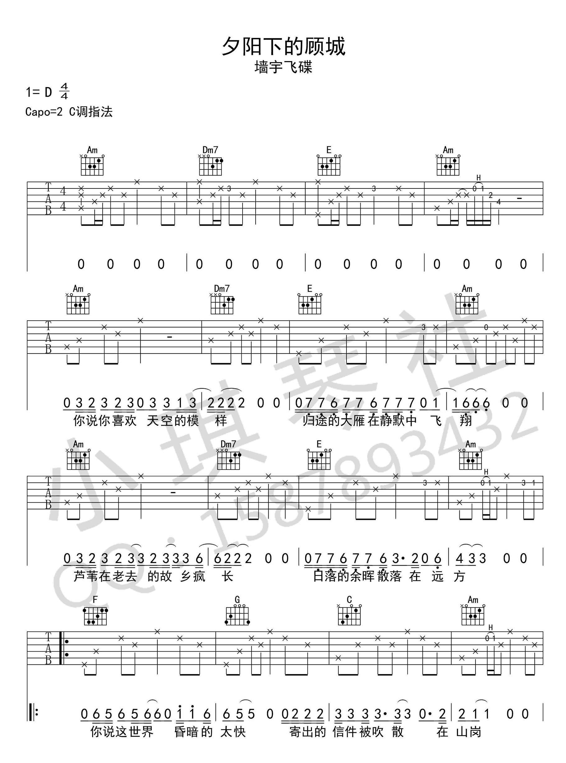 夕阳下的顾城 墙宇飞蝶 C调指法高清版吉他谱 - 夕阳下的顾城 - C调吉他弹唱谱