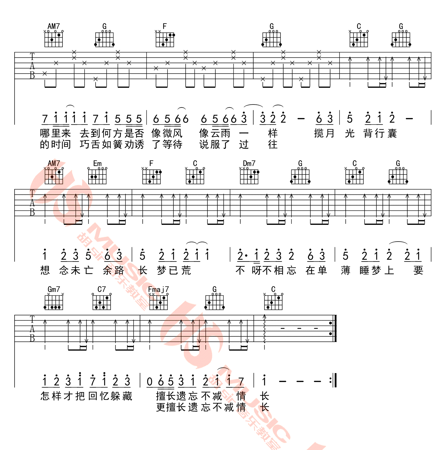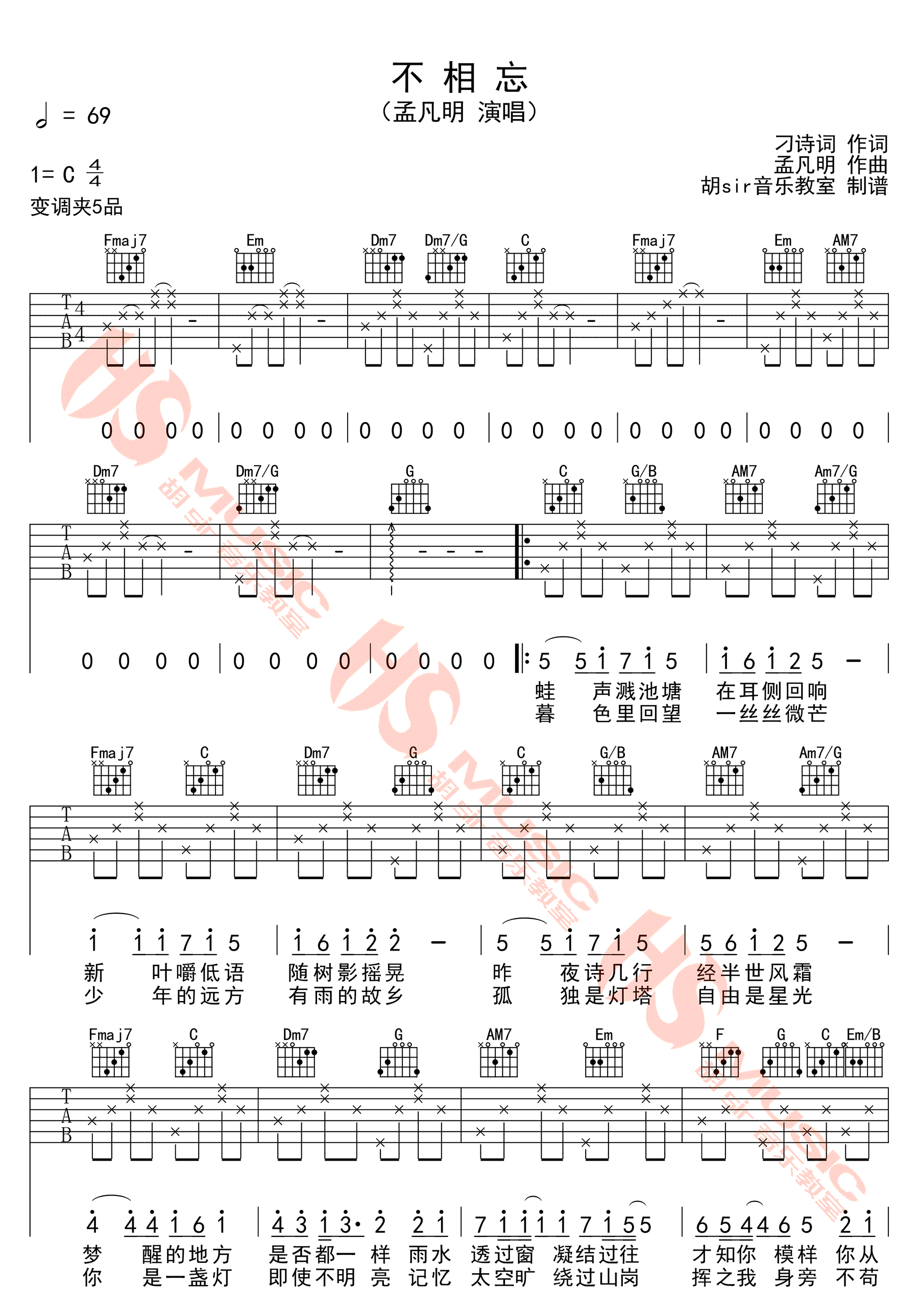 曲谱介绍: 孟凡明《不相忘》吉他谱,C调指法编配,变调夹夹第五品,不相忘六线谱,高清弹唱图片谱,感谢胡sir音乐教室出品。
