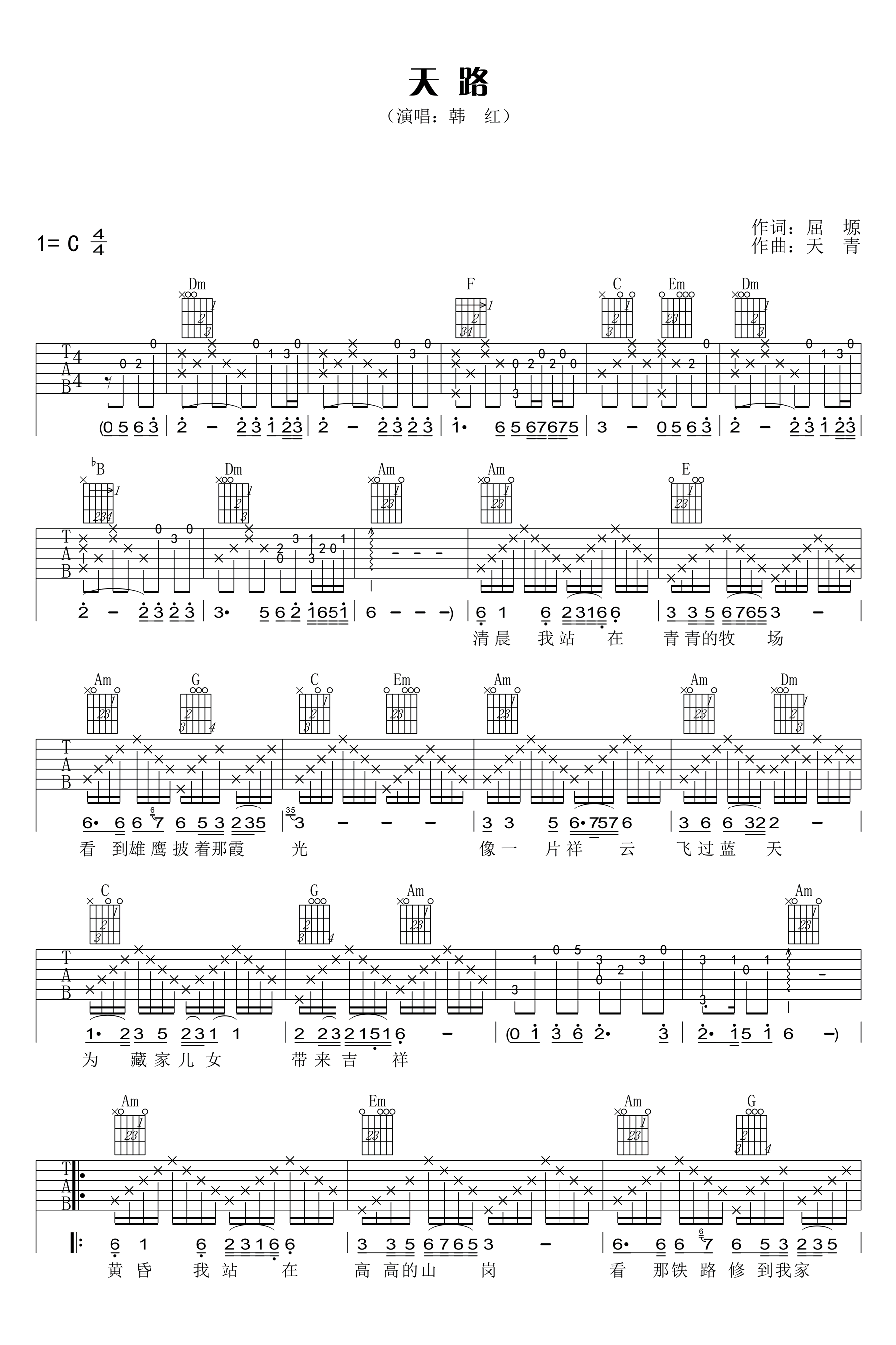 天路 韩红 C调六线吉他谱 - 天路 - C调吉他弹唱谱