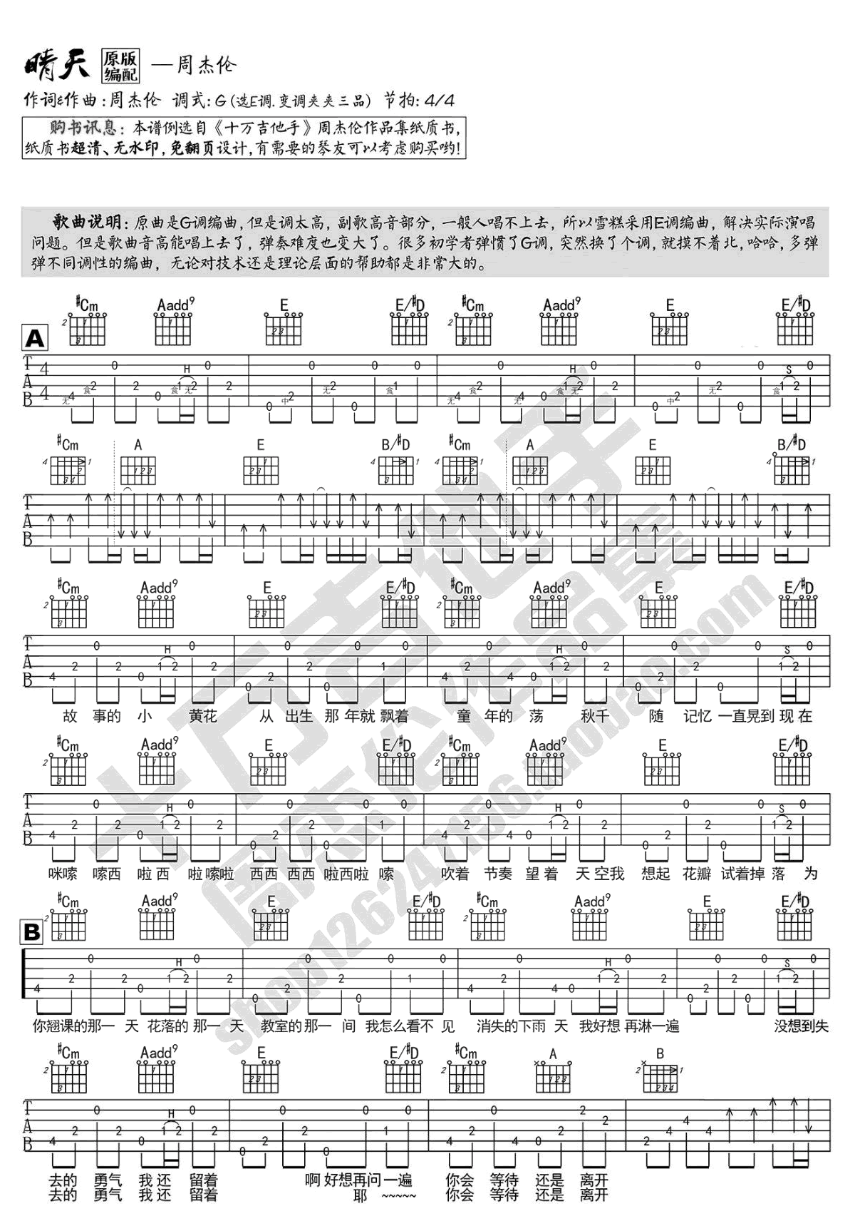 曲谱介绍: 《晴天》吉他谱,周杰伦早期创作的经典代表歌曲,原调G,选用E调,变调夹夹三品,十万吉他手编配出品,琴谱网网站上传推荐。歌曲说明,原曲G调编曲,但是调太高,副歌高音部分,一般人唱不上去,所以雪糕老师采用E调编曲,解决实际演唱问题。但是过去音高能够唱上去了,弹奏难度也变大了,很多初学者弹惯了G调,突然换了个调,就摸不着北了,多弹不同调性调编曲,无论对技术还是理论层面的帮助都是非常大的。