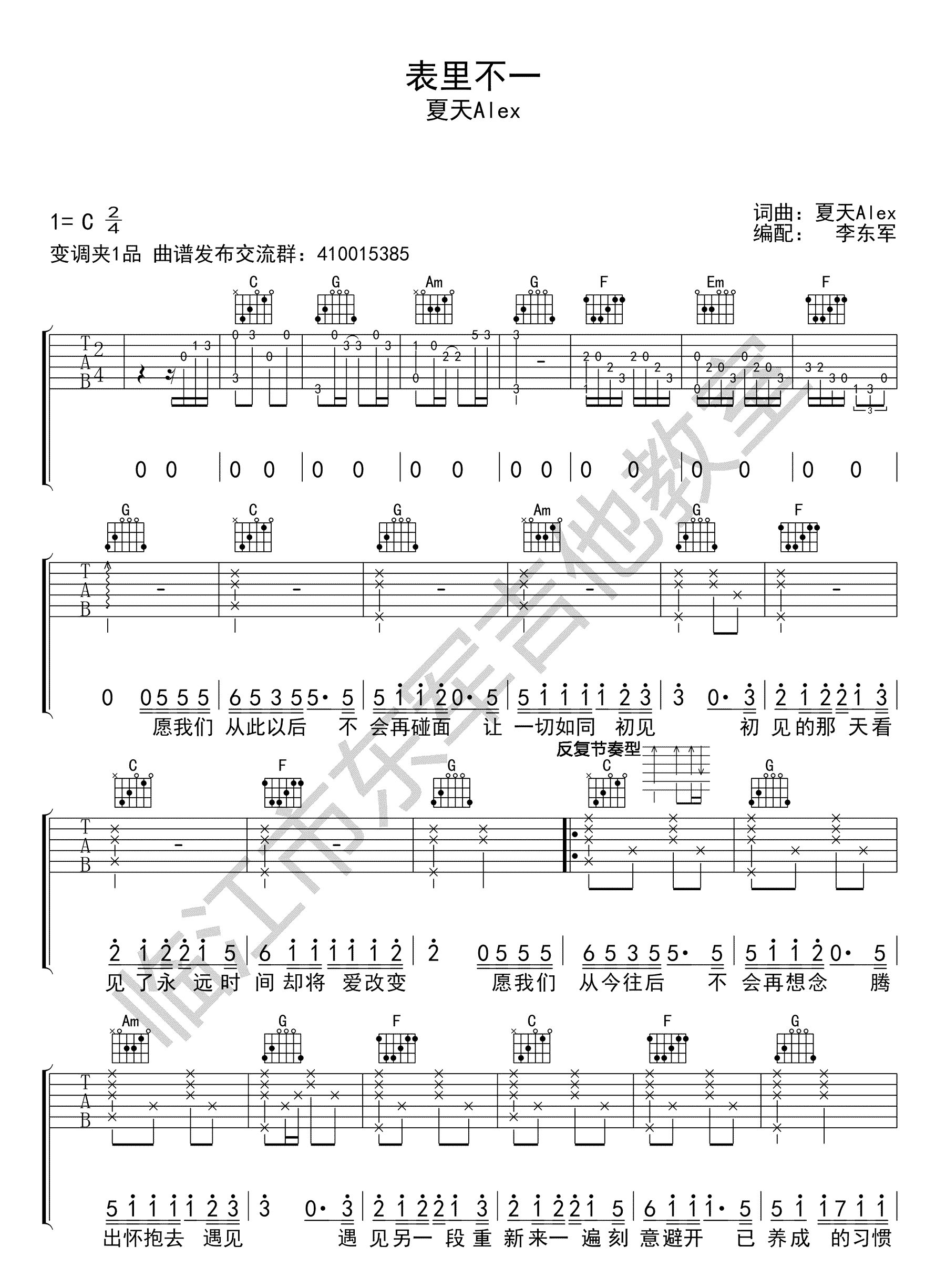曲谱介绍: 夏天Alex《表里不一》吉他谱,C调指法编配,CAPO夹一品,三张图片谱高清版,表里不一六线谱。 以歌曲《不再联系》火爆全网络的歌手夏天Alex,带来的又一首治愈系曲风的伤感歌曲。我想要放弃放弃放弃你 ,却再而三的拿起,在彼此心里,表里的不一还在默默持续。