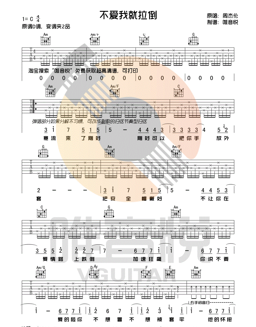 曲谱介绍: 不爱我就拉倒吉他谱,C调指法六线谱,变调夹夹二品。周杰伦的变化实在太快了,前两个月还在等你下课,现在不爱就拉倒了。曲谱为吉他弹唱谱完整版,三张图片谱例,感谢唯音悦出品。 编配演奏说明:主歌和过门分解都可以改成扫弦,和副歌扫弦节奏型一样的就行。用了一些转位和弦,指法安排可以多用大拇指反扣这一个技巧!Rap部分和结尾部分和弦结构与副歌还是有点不一样,琴友们稍微注意一下哈!
