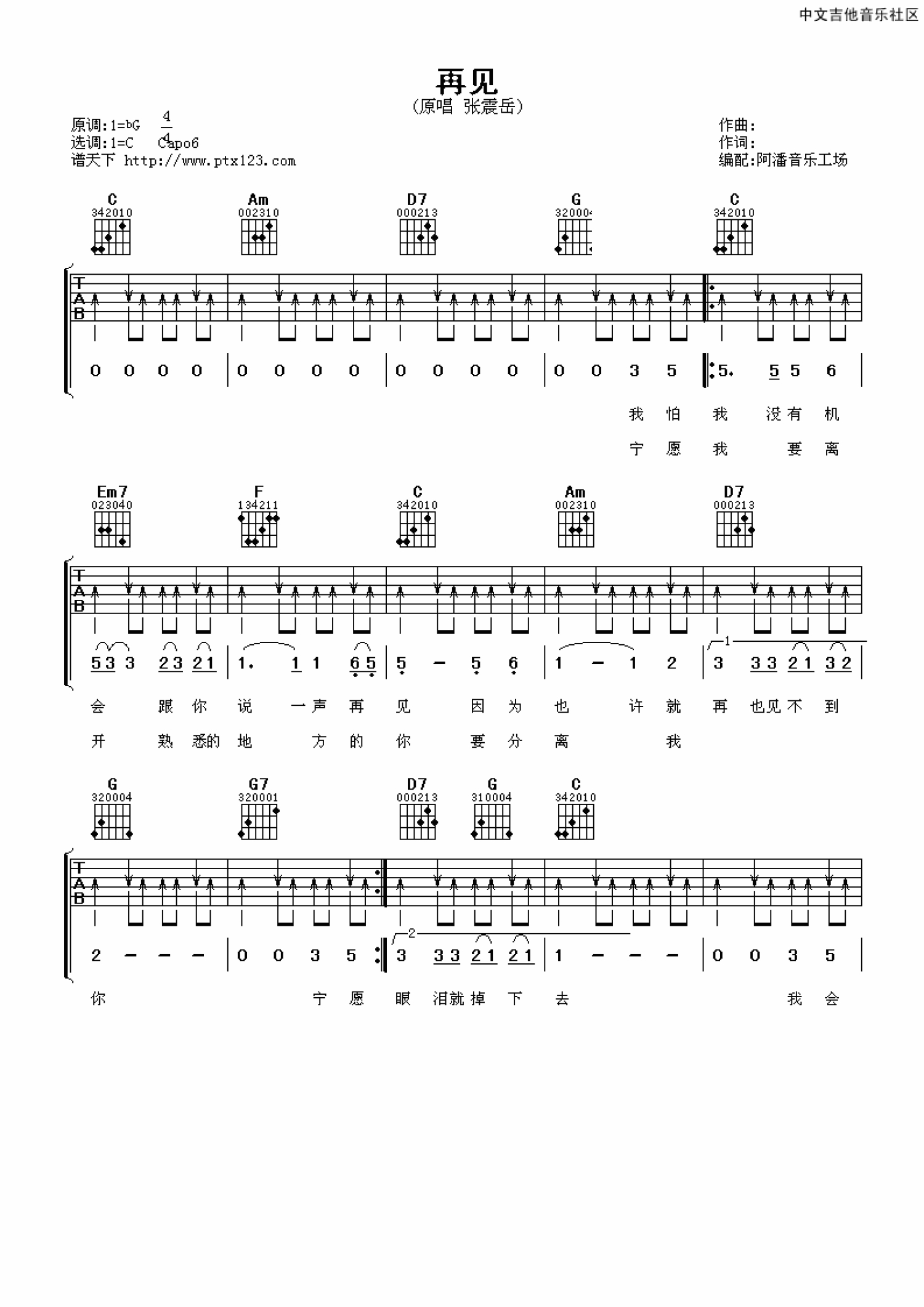 再见吉他谱 - 张震岳 - C调吉他弹唱谱