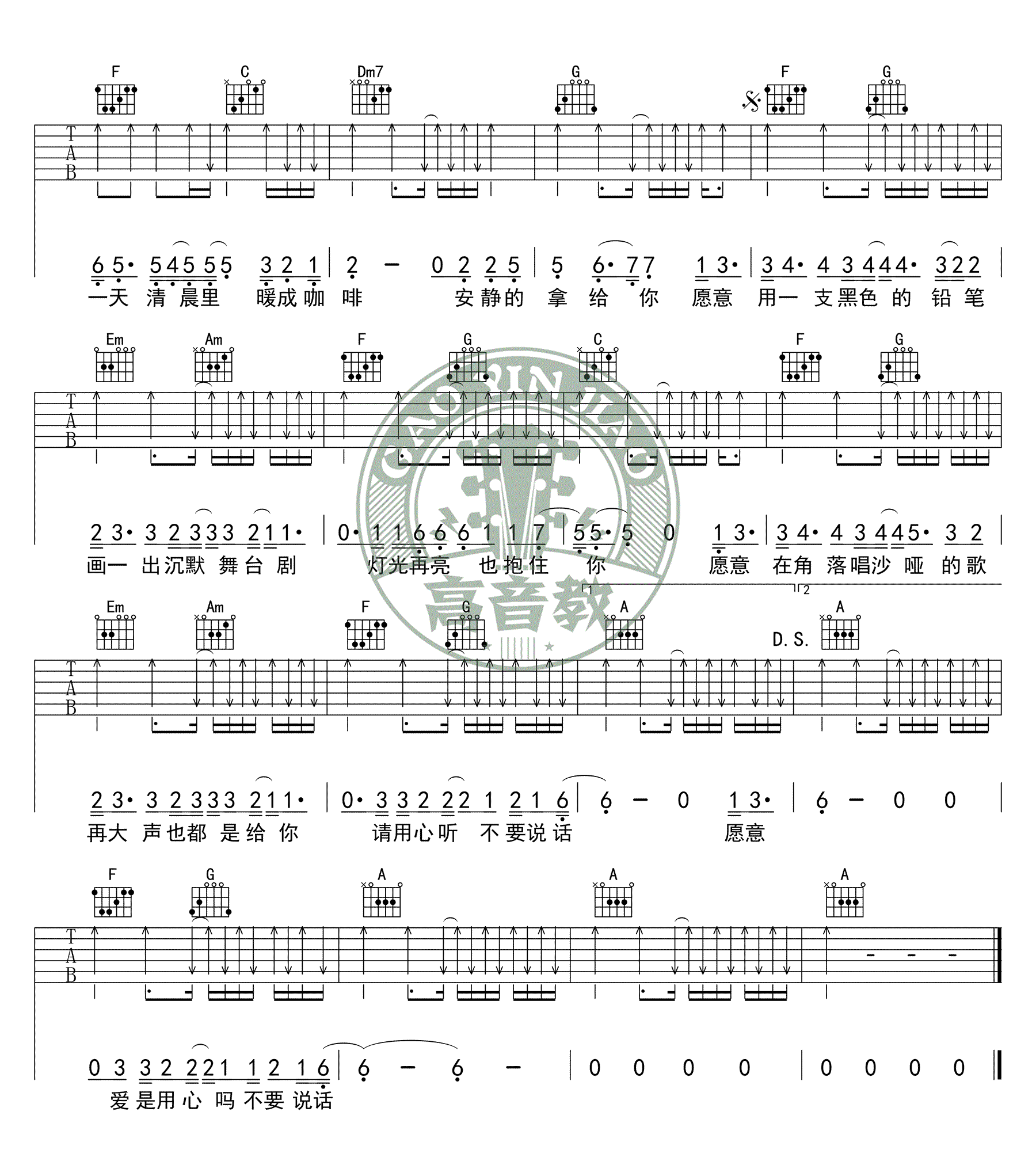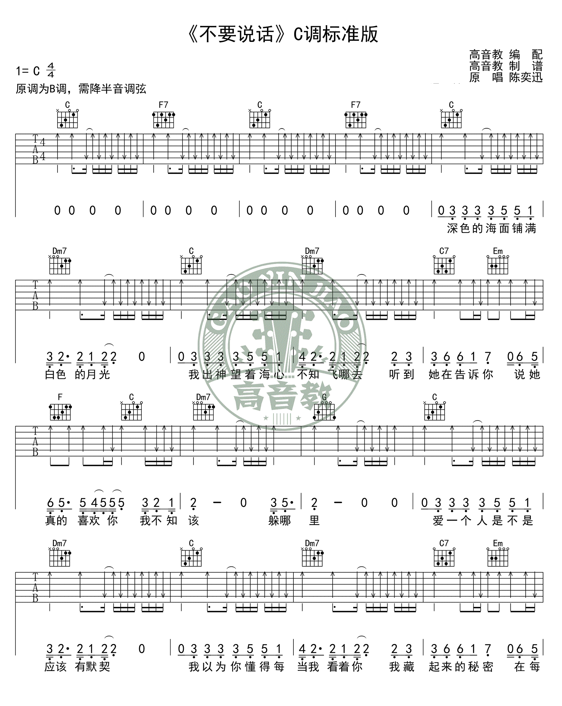 曲谱介绍: 陈奕迅《不要说话》吉他谱,C调标准版,原调为B调,需降半音调弦,不要说话六线谱,高清图片谱,感谢高音教编配出品。随谱附上歌曲的配套吉他弹唱教学视频,琴友们跟随猴哥老师的讲解练习。爱是用心的,心和心的交流就可以感知对方的情绪,很多时候并不需要用语言,只需要一个吻甚至一个拥抱就够了。请用心听,不要说话。