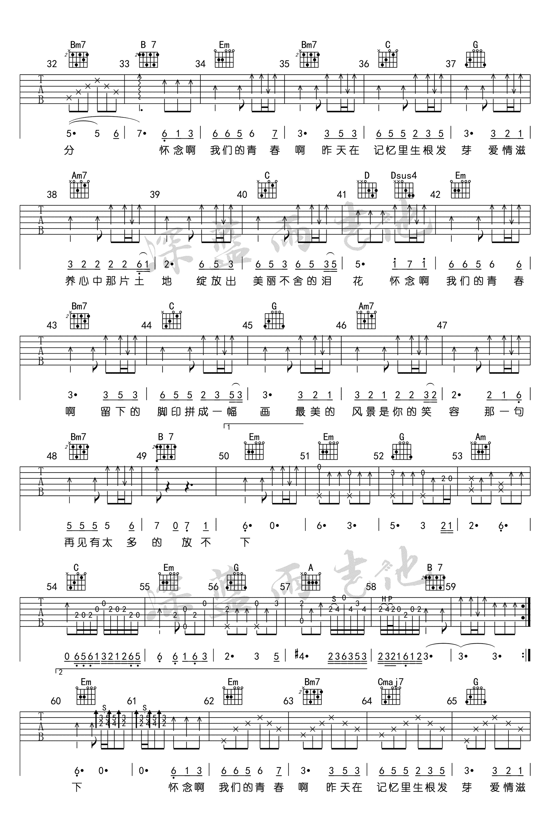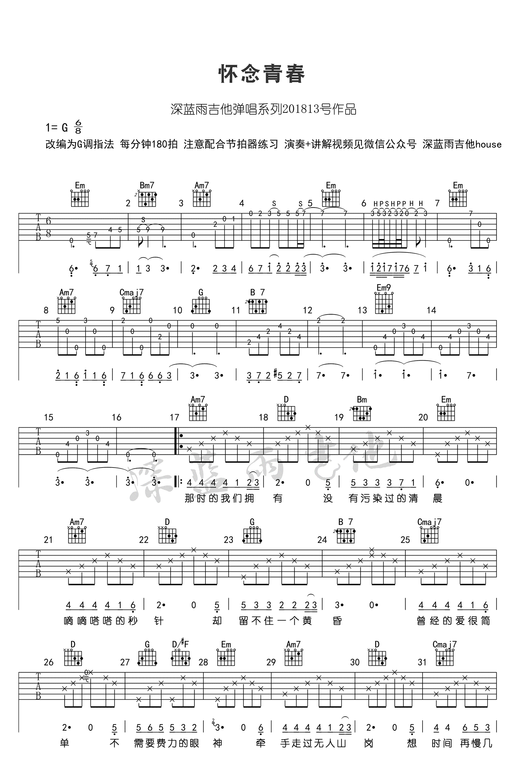 曲谱介绍: 旭日阳刚《怀念青春》吉他谱,G调指法编配,高清弹唱谱,深蓝雨吉他出品。说起旭日阳刚兄弟,大家一定都不陌生,当年翻唱的《春天里》火遍网络。而成员刘刚之后演唱的这首《怀念青春》也打动了无数人的心。今天琴友们不妨跟随老师的吉他教学视频,学习弹唱这首歌曲。我们所怀念的并不仅仅是青春,而是我们那些已经流逝的,再也回不来的时光,以及那段生活带给我们的美好回忆。