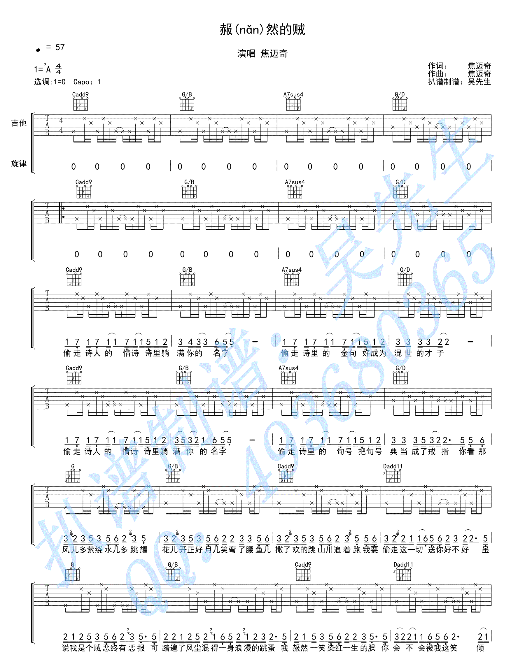 赧然的贼 焦迈奇 G调 六线吉他谱 - 赧然的贼 - G调吉他弹唱谱
