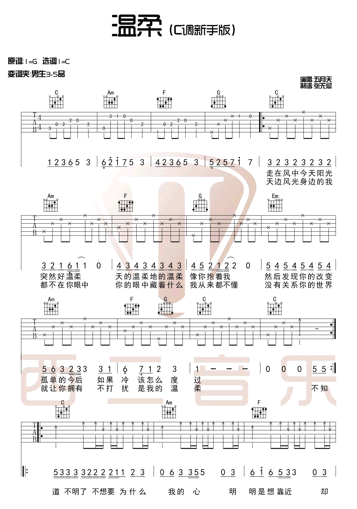 温柔 C调简单版 五月天 六线吉他谱 - 温柔 - C调吉他弹唱谱