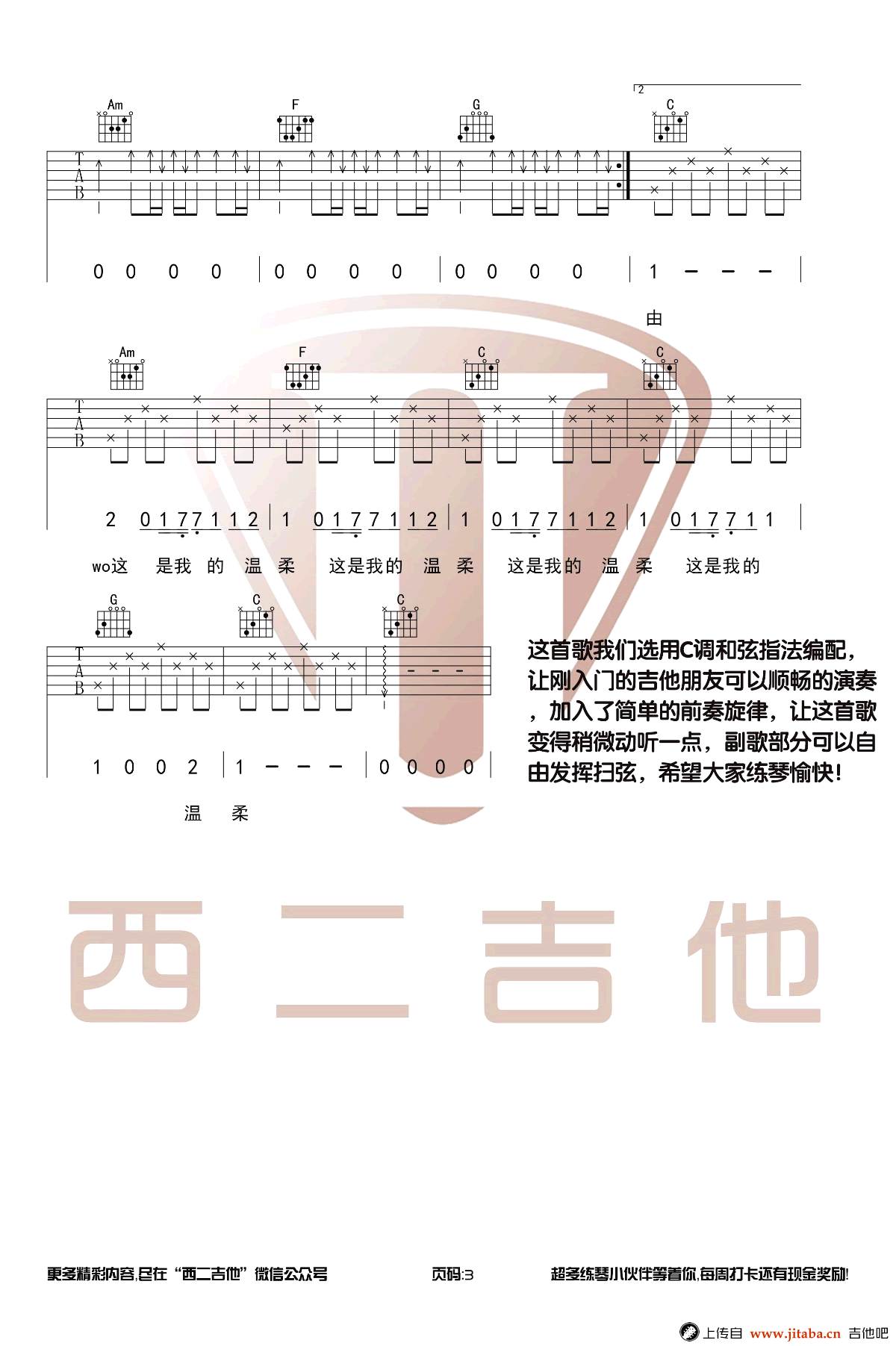 曲谱介绍: 五月天《温柔》吉他谱,C调新手版,变调夹男生3-5品,温柔六线谱,带简单前奏旋律,副歌部分可以自由发挥扫弦,感谢西二吉他编配出品。 如果在少年时代里,轻轻加上一点点「五月天」,那它就成了青春。掰开青春一看,除了让你热泪盈眶的记忆默片,还有一些零零散散的有声零件,其中就有这一首《温柔 》 。
