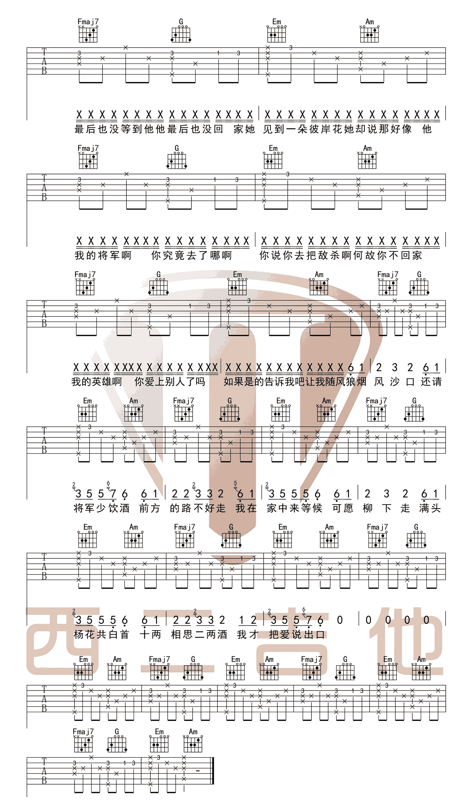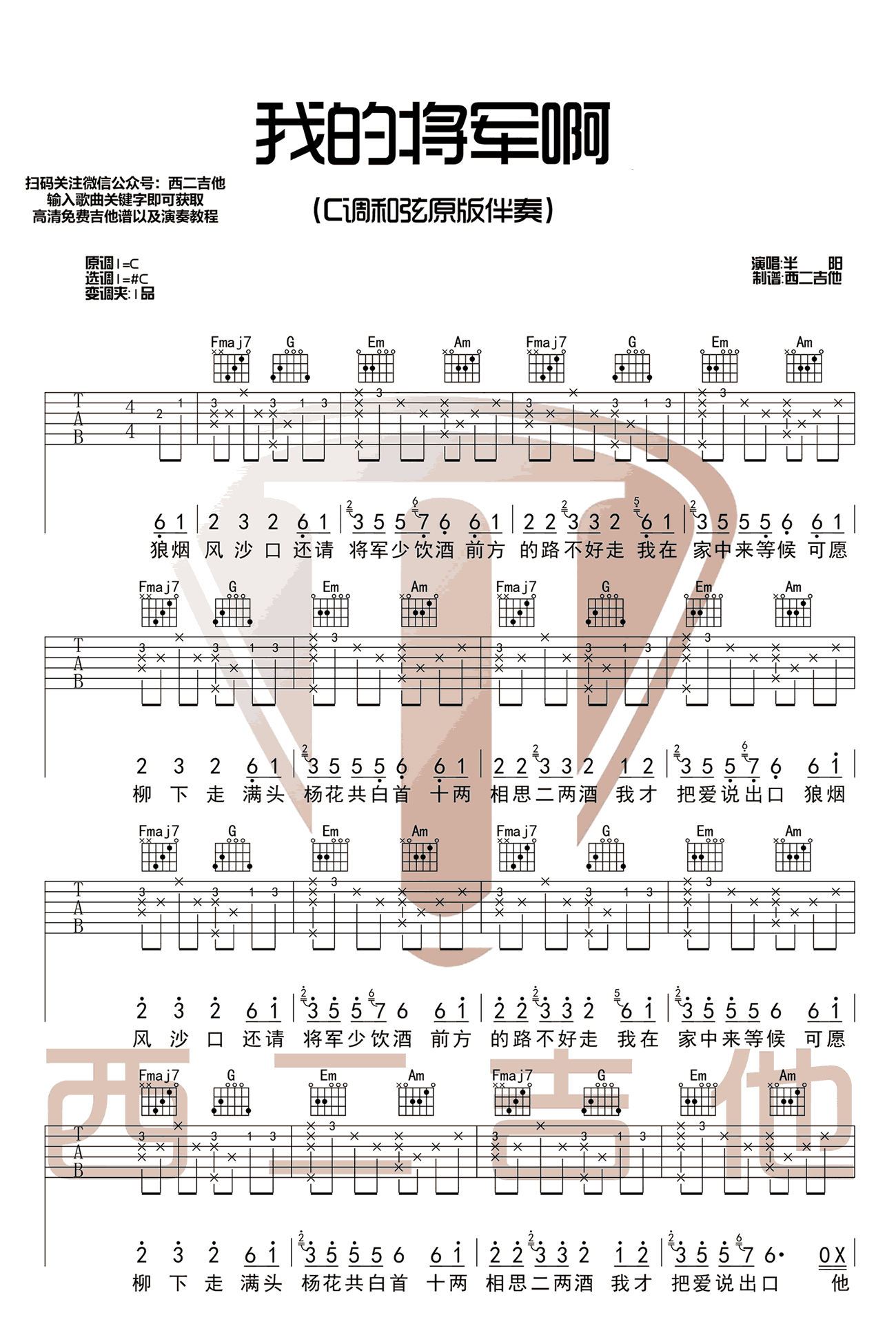 曲谱介绍: 抖音歌曲《我的将军啊》吉他谱,C调和弦原版伴奏,变调夹夹一品,《我的将军啊》六线谱,歌手半阳演唱的一首歌曲,由半阳作词,原曲来自英文歌《watch the pacific》,旋律非常简单,原曲为钢琴伴奏,这里改编成吉他演奏。 狼烟风沙口,还请将军少饮酒,前方的路不好走,我在家中来等候。这首歌在抖音上火的不得了,众多粉丝纷纷点赞,转发量更是惊人,附上一个《我的将军啊》手势舞教程。