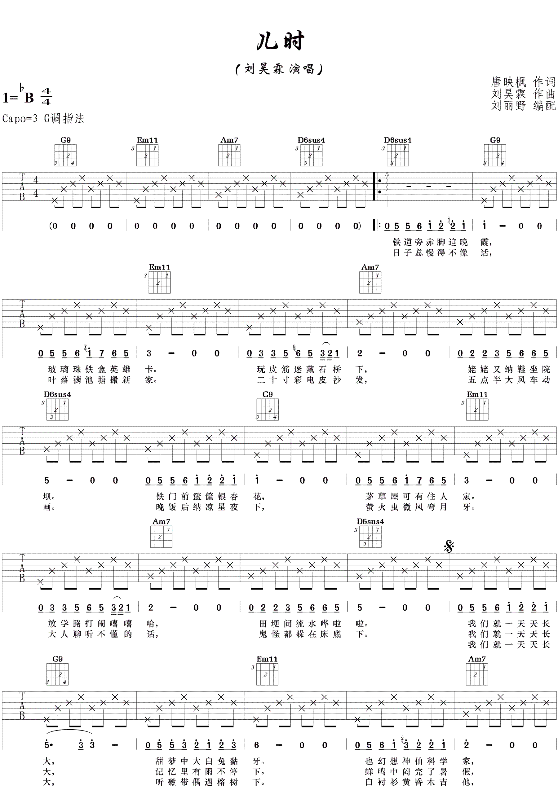 曲谱介绍: 刘昊霖《儿时》吉他谱,G调指法,Capo夹三品,一首充满童趣情怀的吉他弹唱民谣歌曲,儿时六线谱,高清图片谱,感谢吉他小野编配!