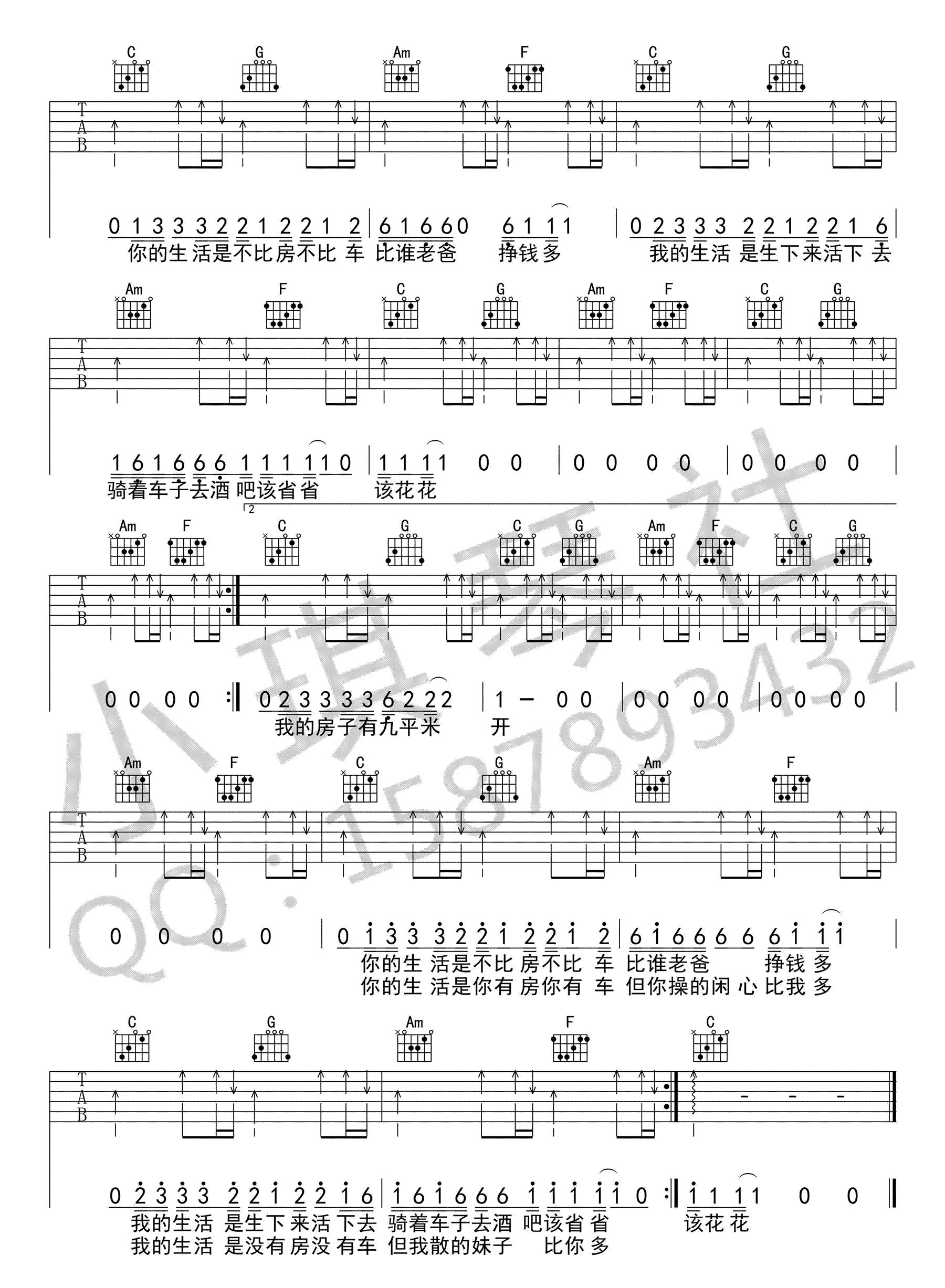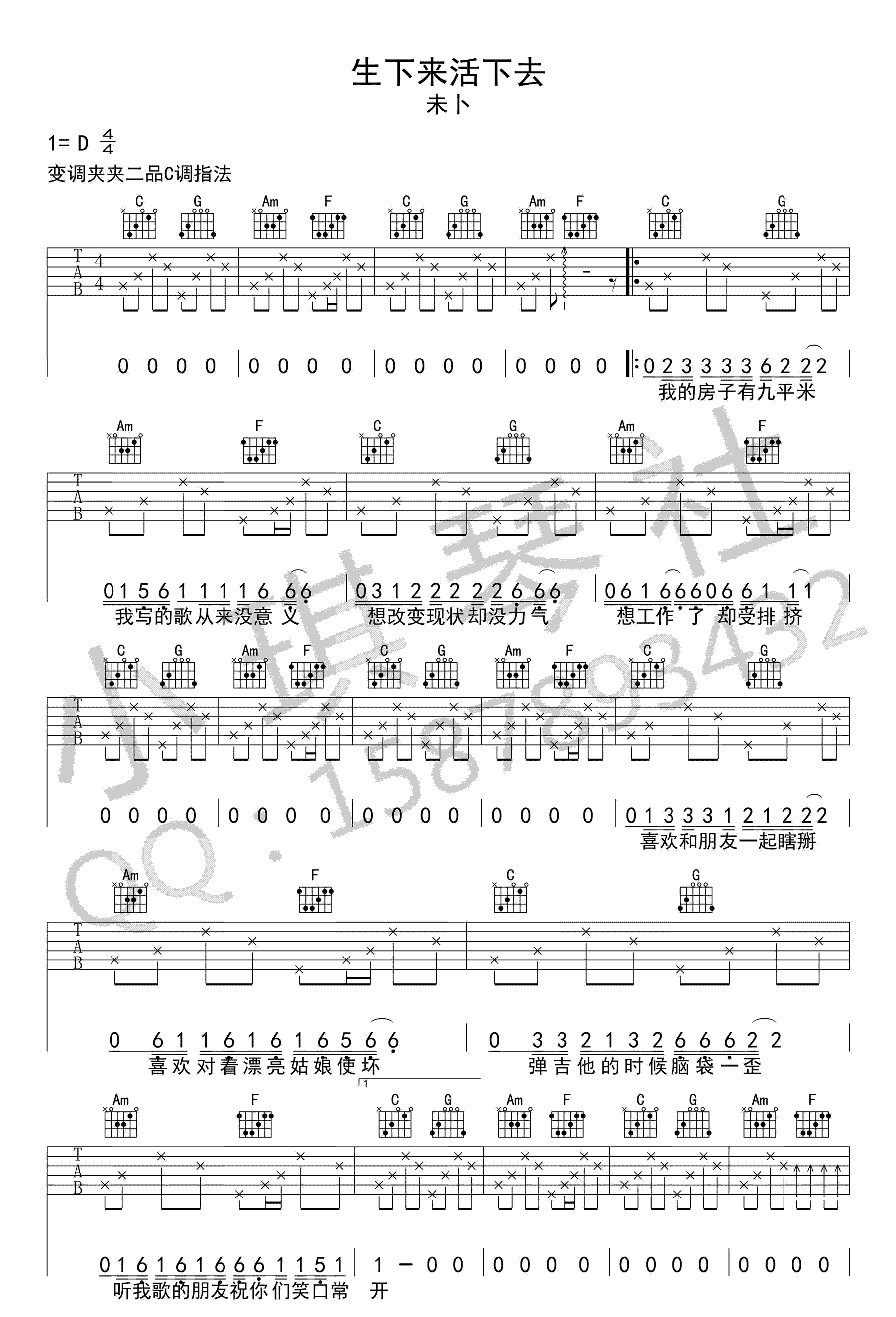 曲谱介绍: 未卜《生下来活下去》吉他谱,原调D,变调夹夹第二品,选用C调指法编配,生下来活下去六线谱,高清弹唱图片谱,小琪琴社出品。人,生下来活下去,如此简单如此难。 难得不嘶吼的佳作,歌词叙事般的铺展开,轻描淡写着不同生活环境下,不同的生活方式和态度。人不怕努力吃苦,怕的是不公平和得不到赏识,不及时调整心态,很难让自己快乐起来。未卜唱出了屌丝的理想心态,你在意的是出人头地互相攀比,我珍惜的是唱歌喝酒自由恣意,你有你的世界,我有我的天地。