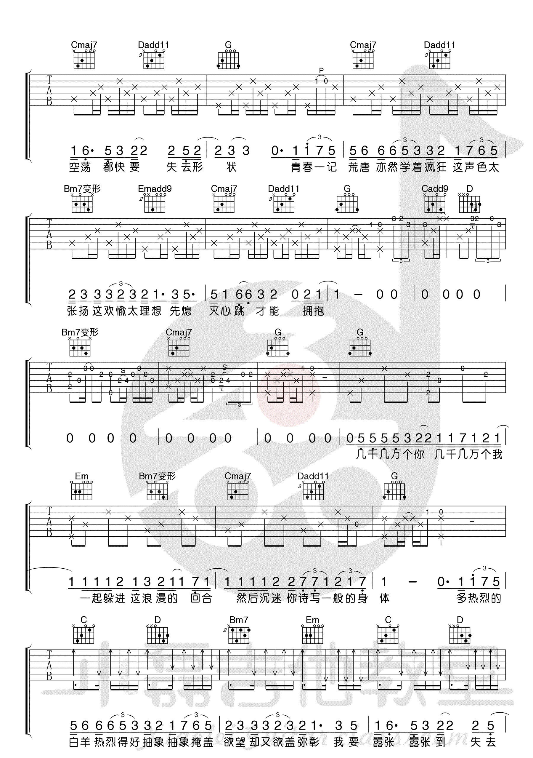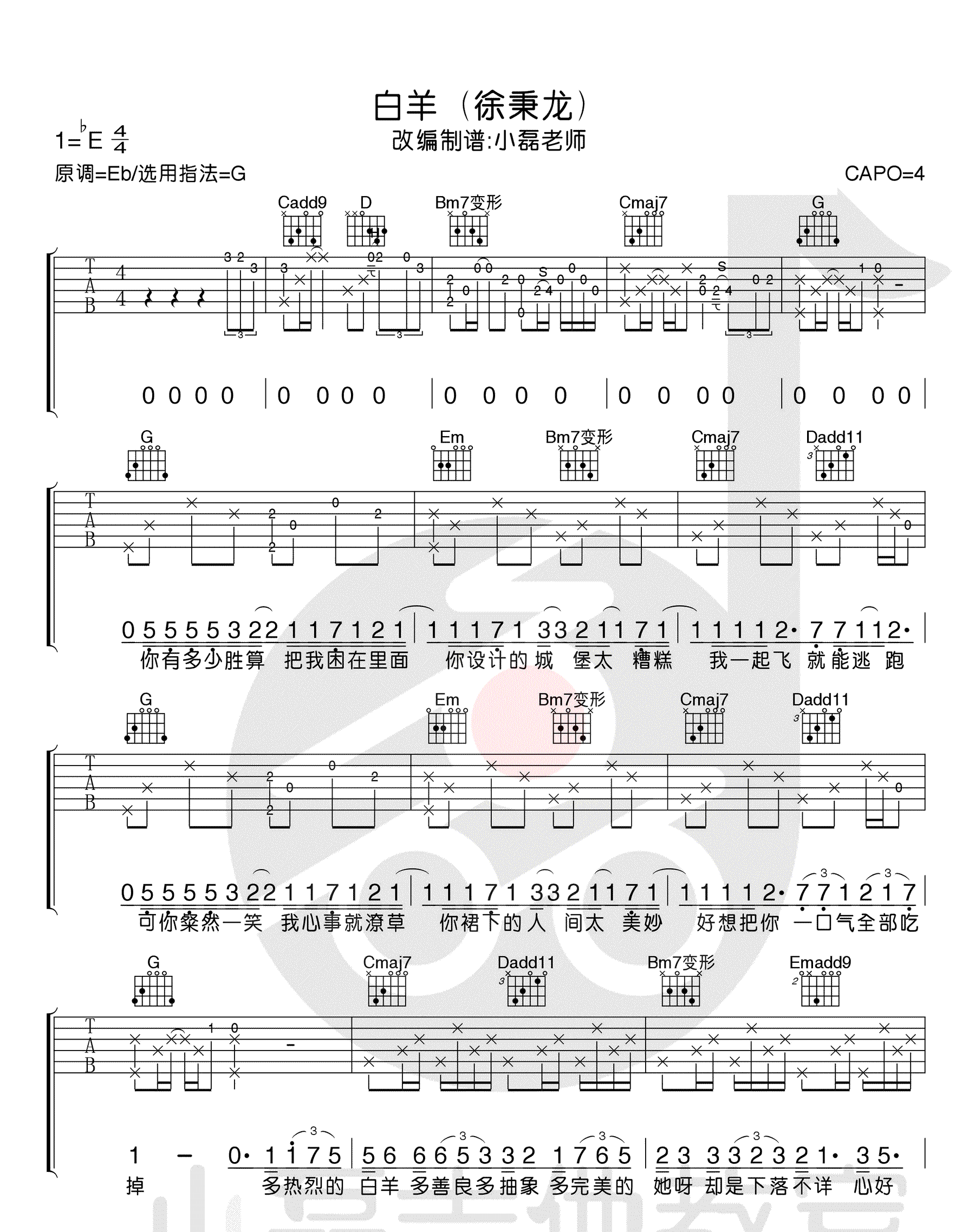 曲谱介绍: 徐秉龙《白羊》吉他谱,原调降E,选用C调指法,CAPO夹四品,白羊六线谱,高清弹唱图片谱,配套教学视频。感谢小磊吉他出品。编配说明:这首歌原版的编排需要特殊调弦,对于大部分同学可能略有难度,并且很多的演奏与节奏都不利于弹唱!老师制作这个乐谱是改编版本,里面有很多老师的个人理解思路在里面,没那么难,但是还是保留了很多原版的味道!