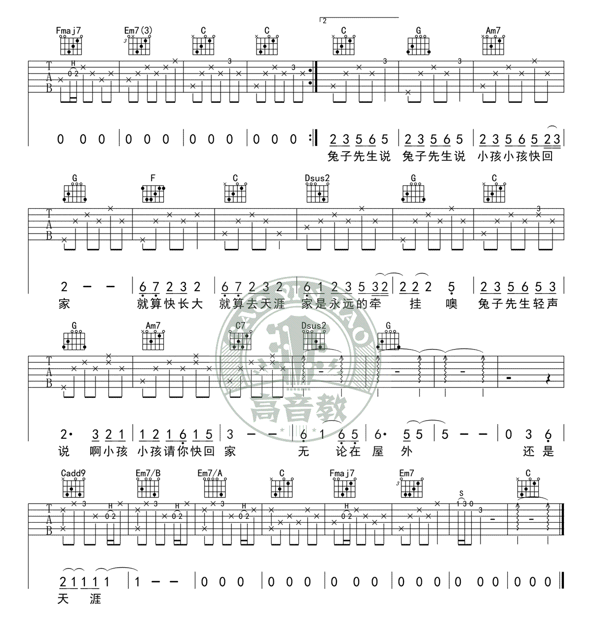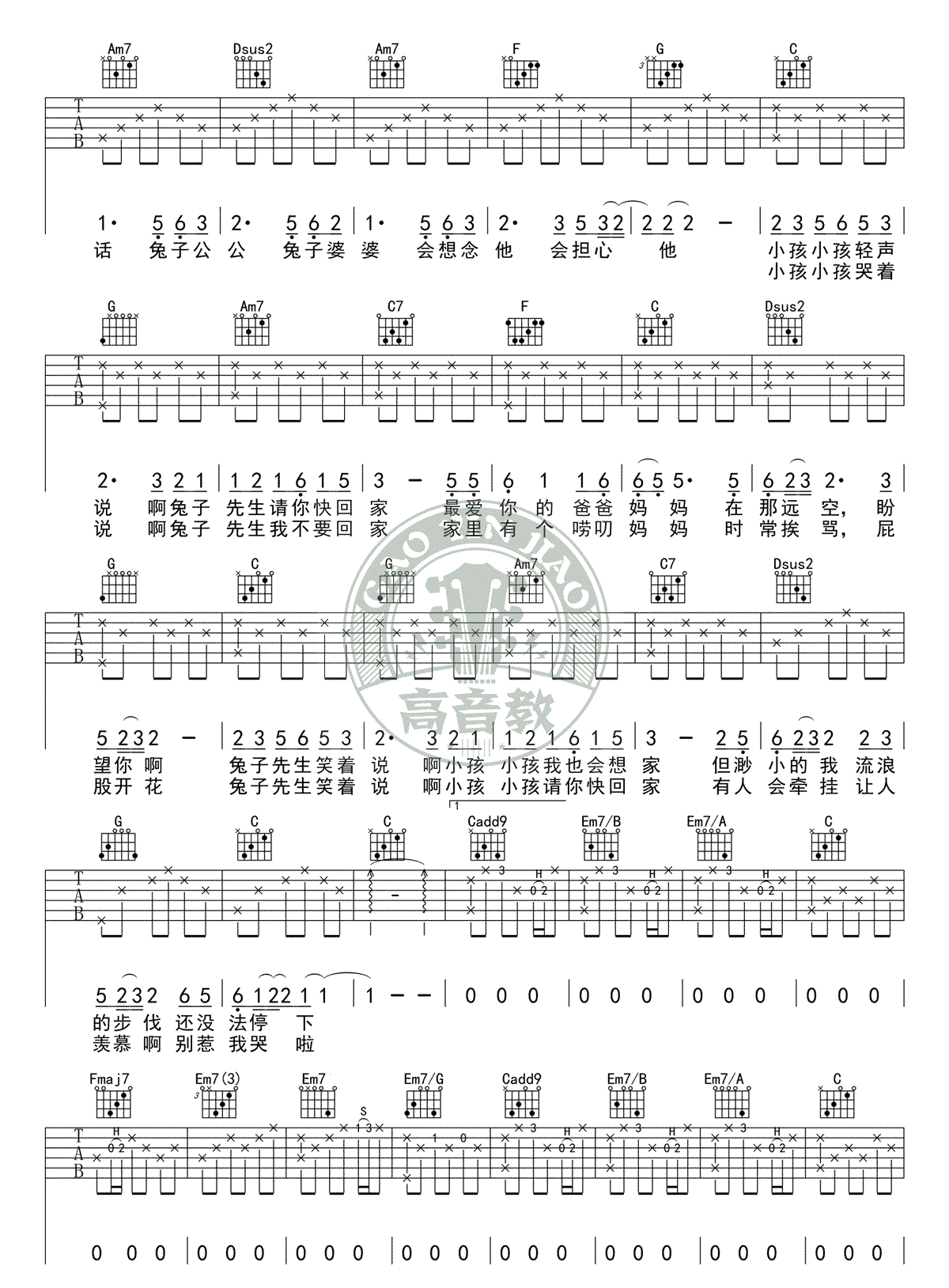 曲谱介绍: 兔子先生吉他谱,C调标准版,配套吉他弹唱教学视频,洛天依演唱的一首民谣歌曲,虽然是合成音,但是调调蛮温柔的。兔子先生六线谱,三张高清图片谱高音教编配出品。   远方的游子啊,你是否会在此刻想起故乡,想起那个最温暖的港湾。轻柔温馨的歌谣充满童真,想家的情绪在歌声里慢慢弥散,愿时光温柔以待,安然无恙。
