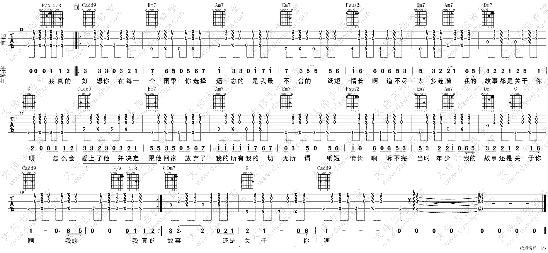 曲谱介绍: 纸短情长吉他谱,男生调曲谱,C调指法高清弹唱谱,女生推荐变调夹夹四品,和弦使用九个。一首抖音神曲,烟把儿乐队《纸短情长》吉他弹唱谱,本次为琴友们送上的是大伟吉他教室编配出品。