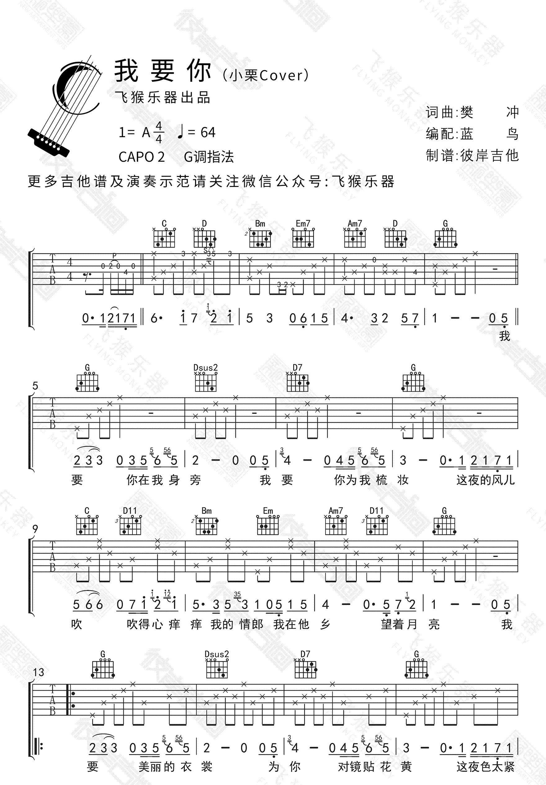 曲谱介绍: 我要你吉他谱,电影《驴得水》主题曲,任素汐原唱的一首动听情歌,我要你吉他六线谱,高清图片弹唱谱,感谢飞猴乐器出品,这首歌曲的编配是在老狼和任素汐的两个版本的基础上做了简单的改编,A调用变调夹夹二品,G调指法难度不大,全曲没有大横按和弦。随谱附上《我要你》吉他弹唱示范视频,小栗Cover,蓝鸟老师吉他。