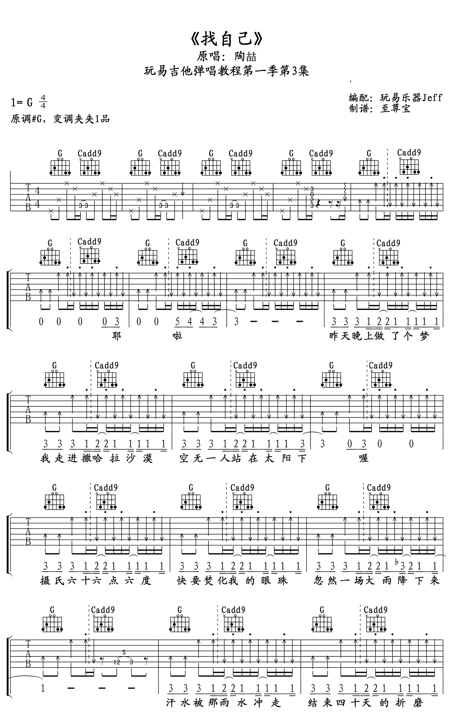 曲谱介绍: 找自己吉他谱,陶喆演唱的一首经典老歌,原调#G调,变调夹夹一品。找自己六线谱,高清弹唱图片谱。感谢玩易吉他JEFF编配,琴谱网网站推荐分享。   《找自己》是陶喆99年时唱火的一首歌,现在听着依然流行不落后,这首歌由于特别经典而被许多人翻唱。