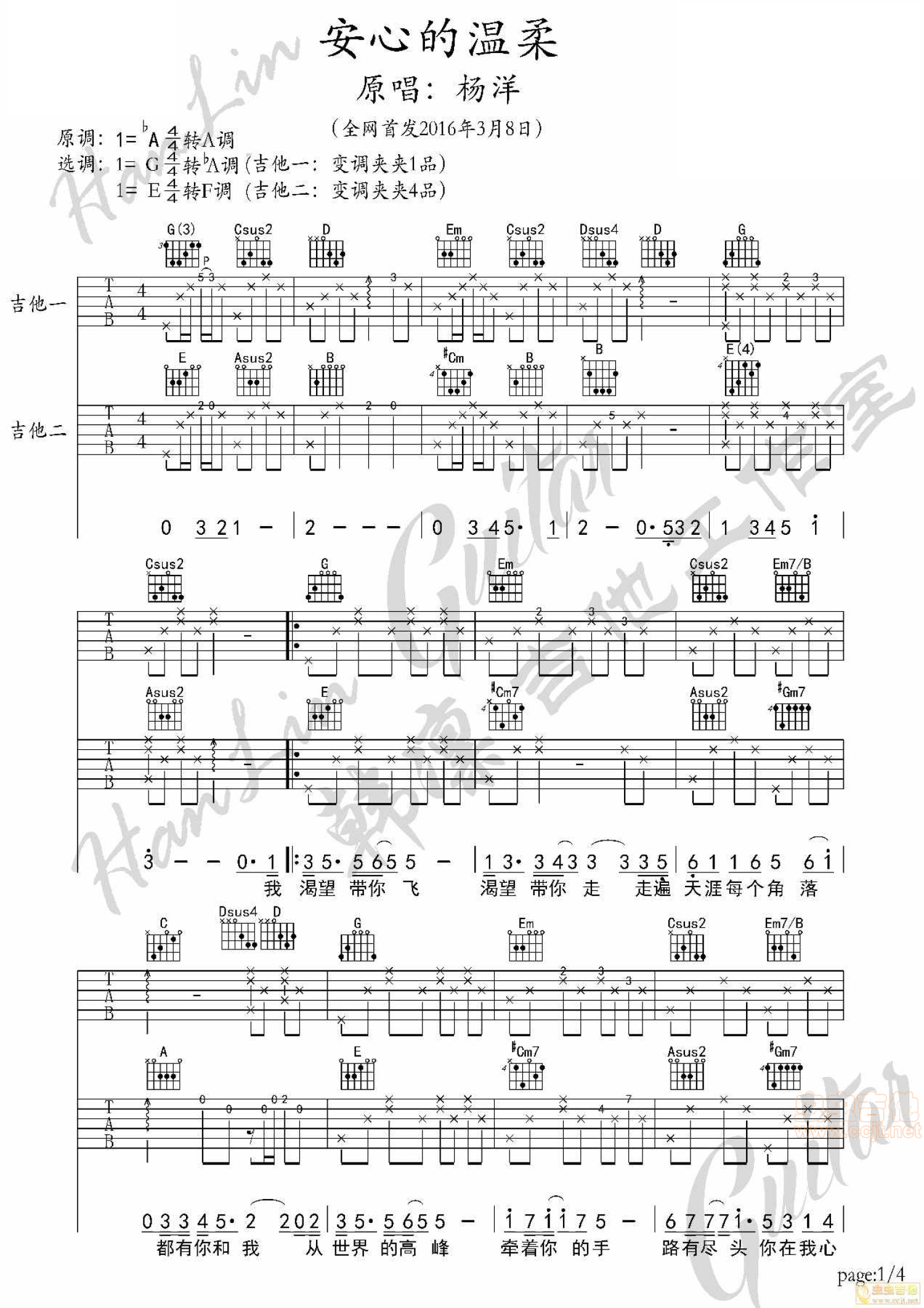 安心的温柔吉他谱 - 杨洋 - G调吉他弹唱谱 - 双吉他版本编配
