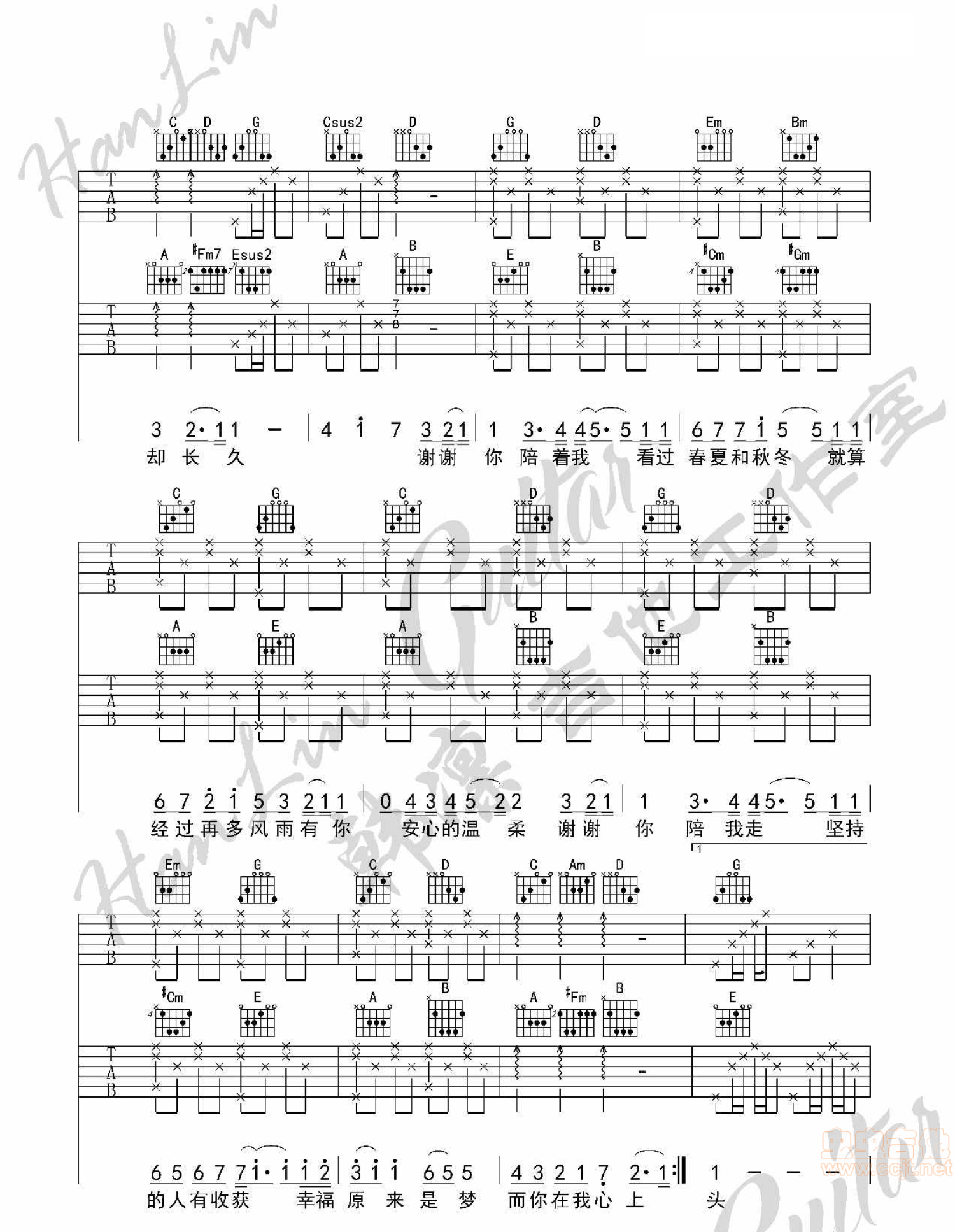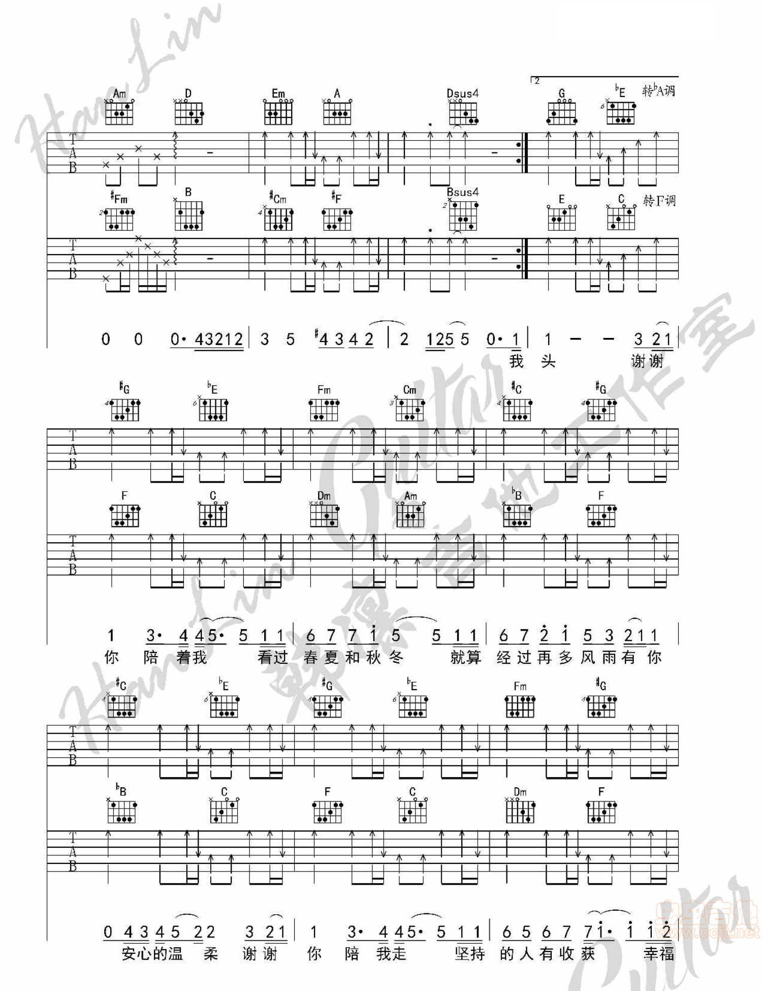 曲谱介绍: 歌曲中道出了一路以来的支持与温暖,旋律轻柔,意义真挚。歌曲原调bA调,吉他一选调G,变调夹夹一品,吉他二选调F,变调夹夹四品。