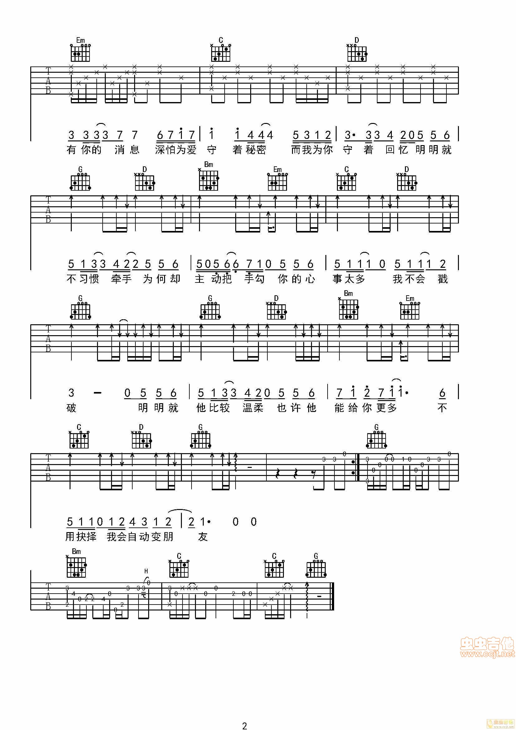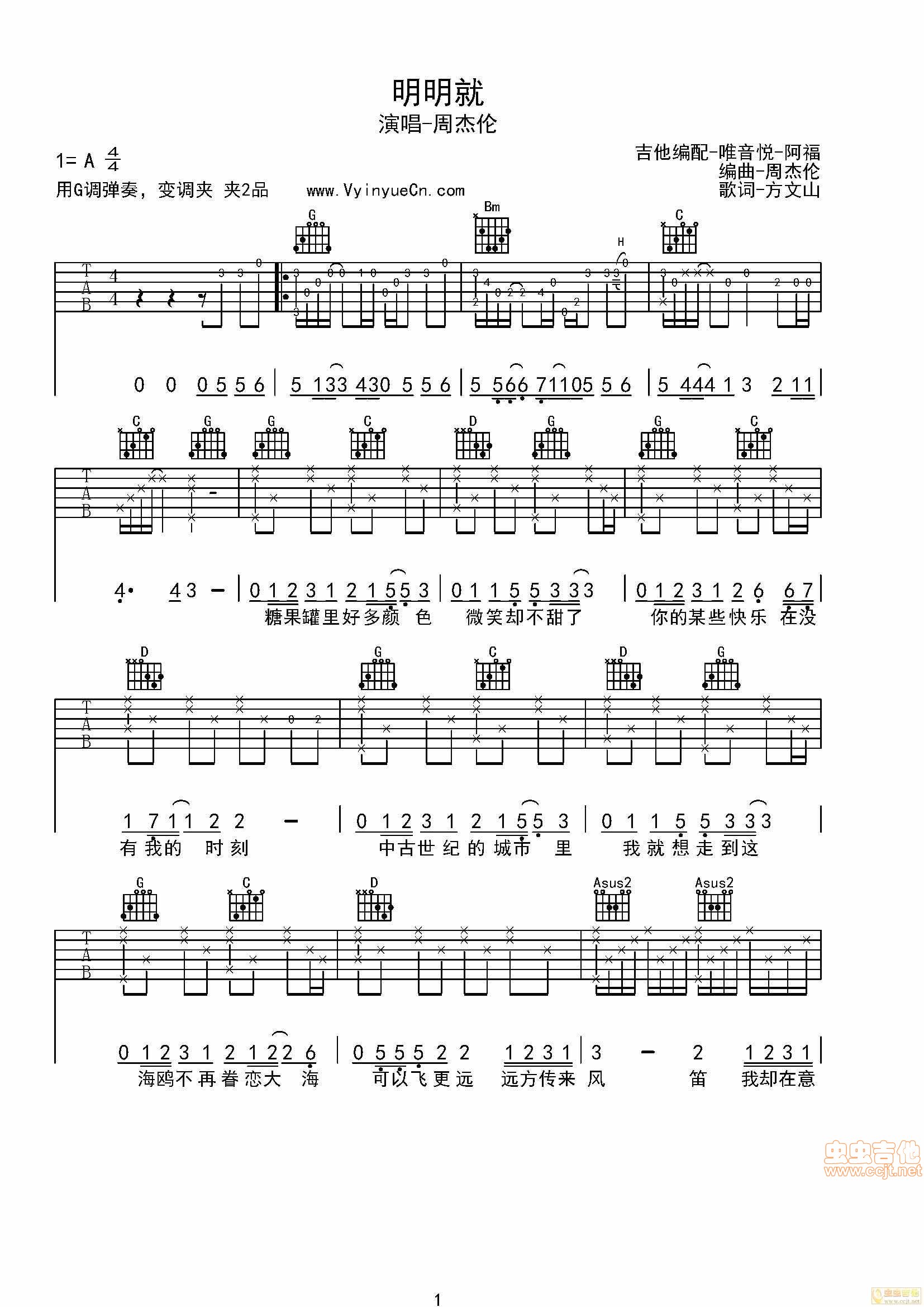 曲谱介绍: 《明明就》吉他弹唱谱,采用G调指法编配,共有2张高清图谱,免翻页排版设计。